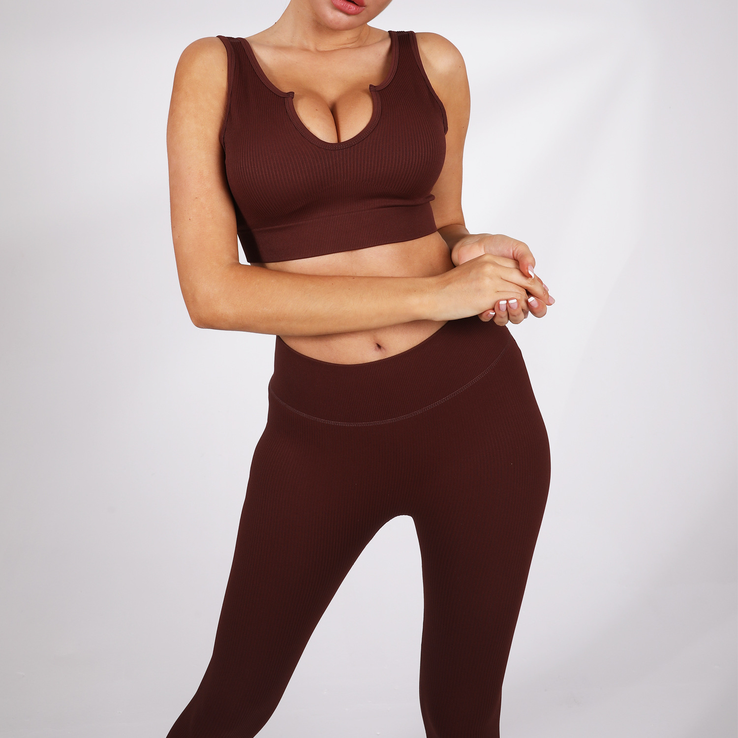 • G9115 스퀘어 칼라 브라 + 바지 세트-다크 브라운