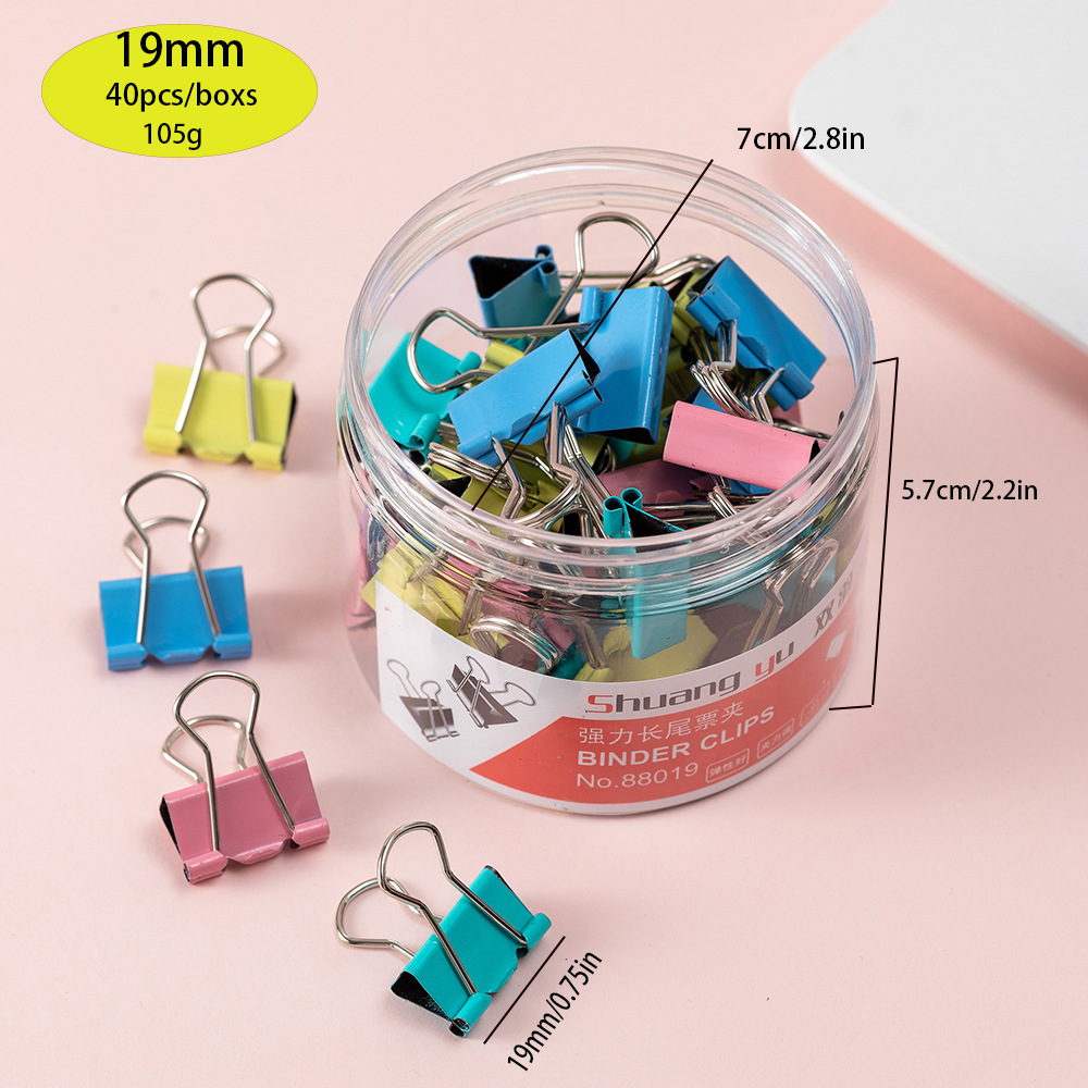 | NO:8819 | 19mm彩色长尾夹 | 40只*96桶 | 44*29*24 cm | 12/11 kgs |