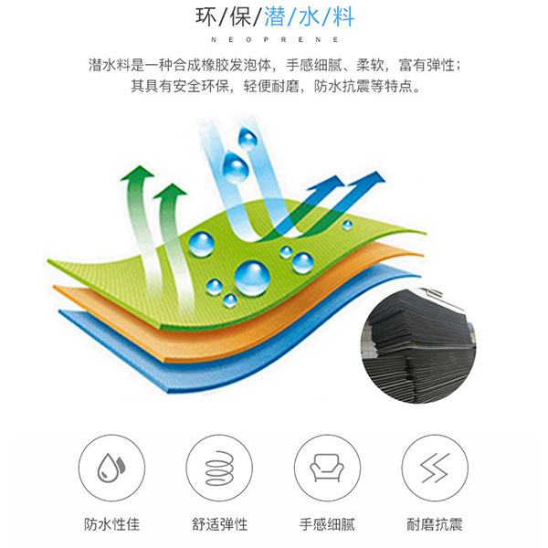 潜水料是一种合成橡胶发泡体,手感细腻,柔软,富有弹性,具有防震,保温,弹性,不透水,不透气等特点。广泛用于潜水料的制造,所以大家就为它起了个通俗易懂的名字:Neoprene(潜水料)。