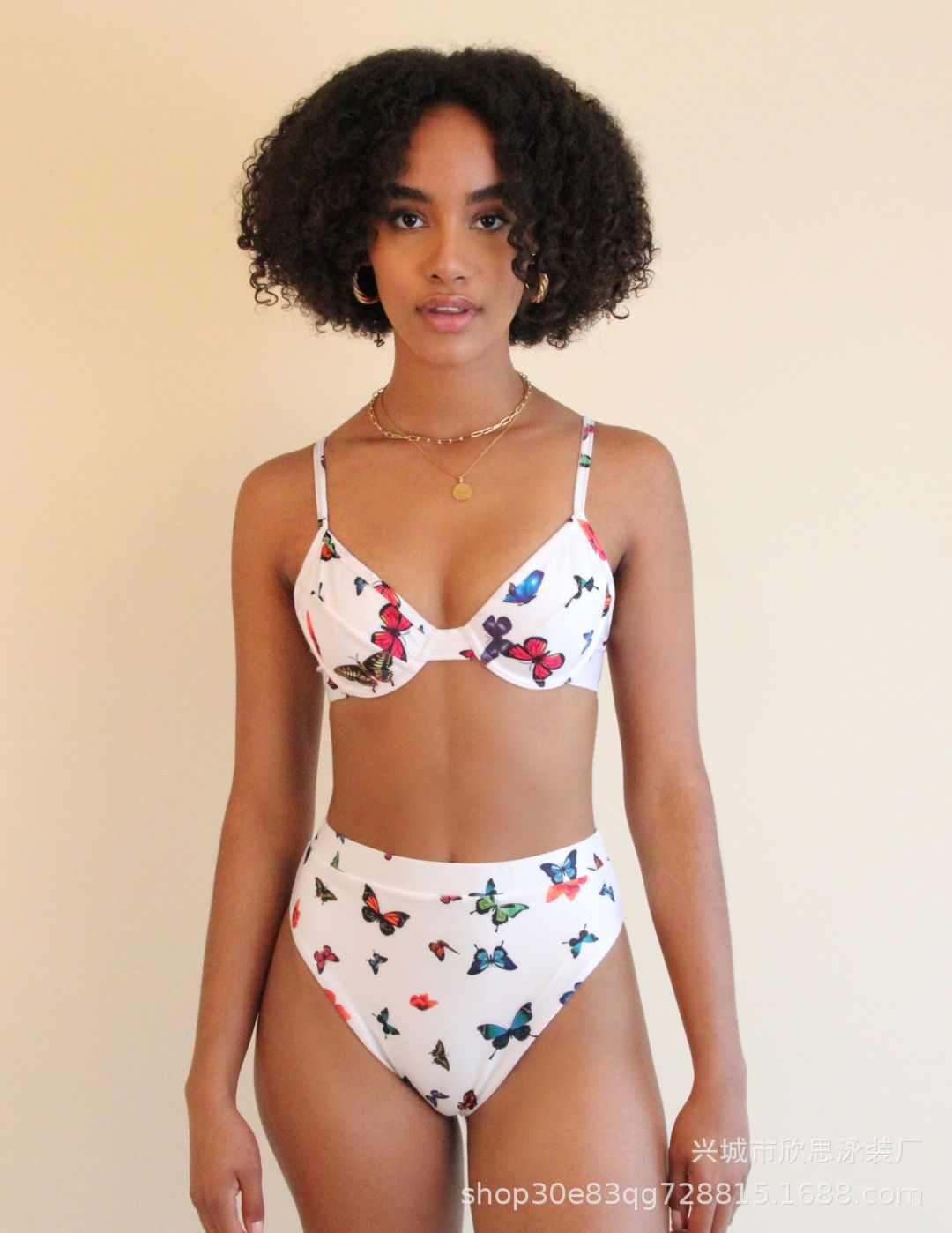 欣思2021亚马逊新款高腰分体女士比基尼钢托软包蝴蝶印花泳衣wish