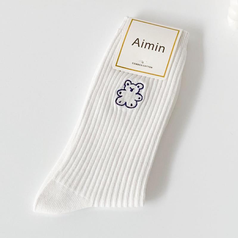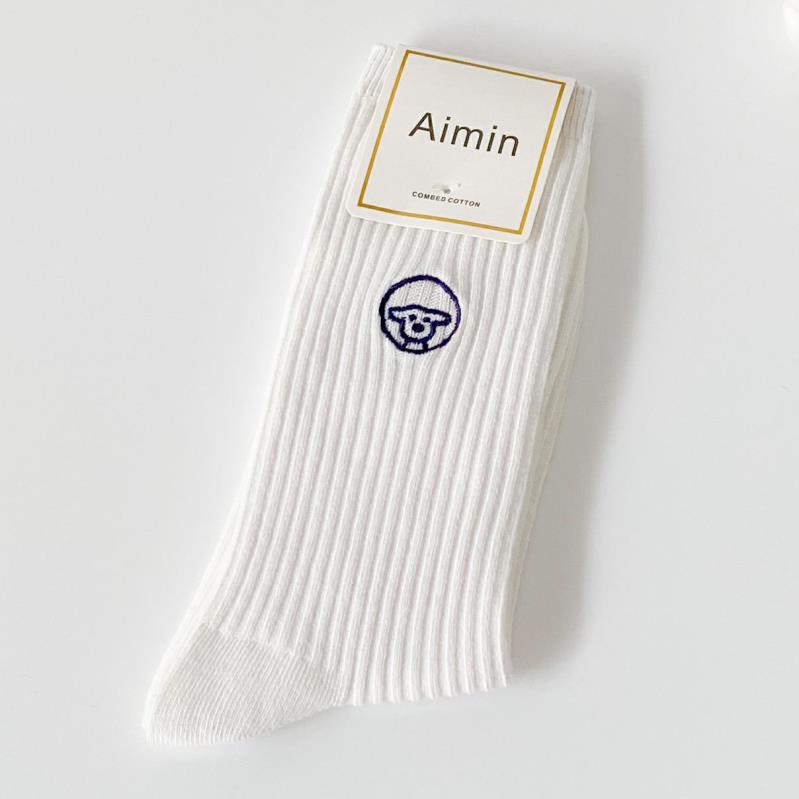귀여운 만화 수 놓은 흰색 양말 봄과 여름 트렌디 한 한국 jk 면 양말 스트라이프 여성의 중간 튜브 일본 스택 양말스토어 가기