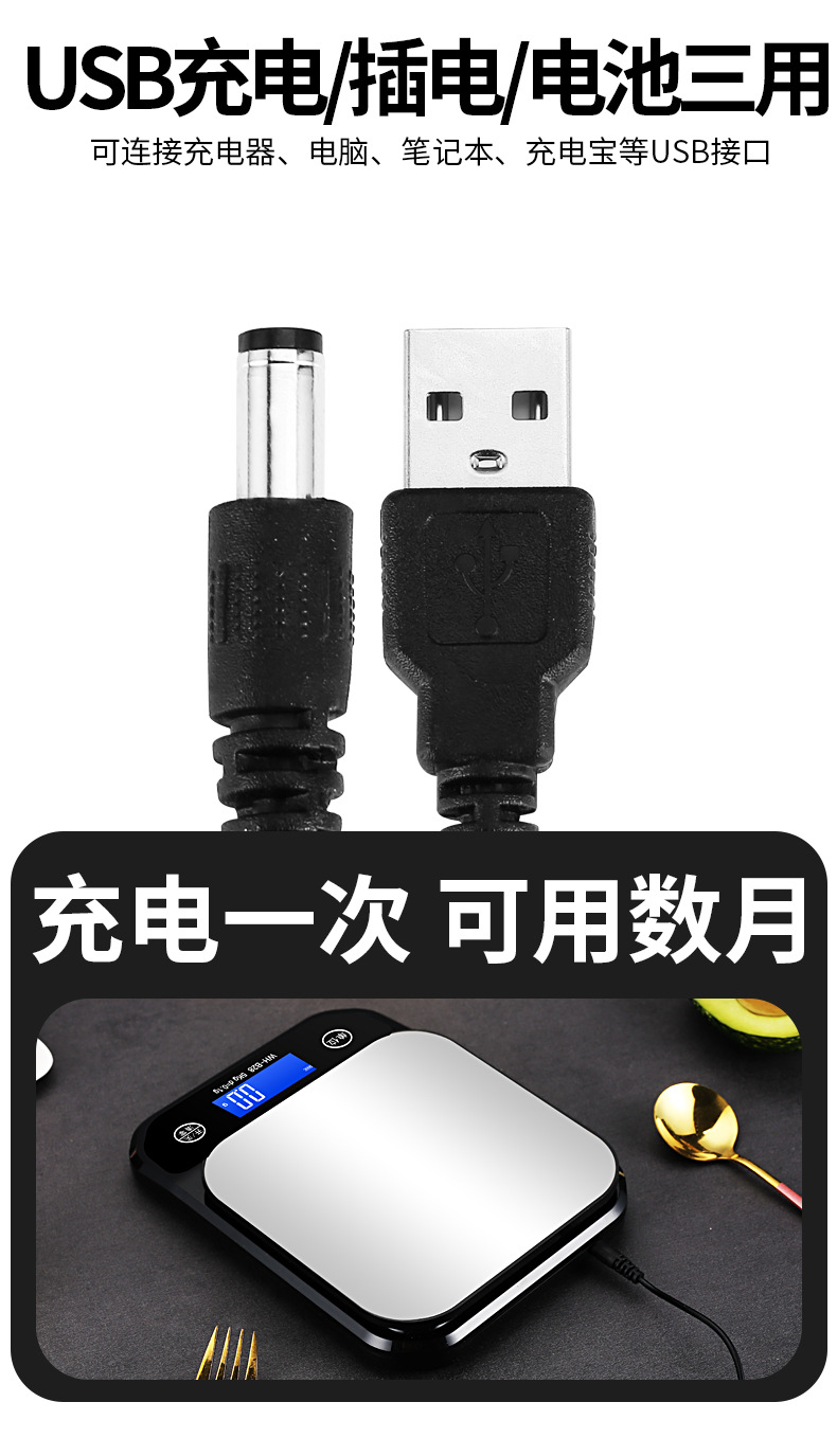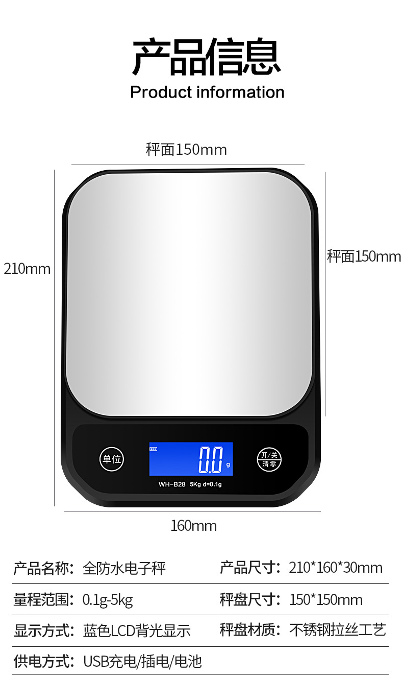 防水厨房秤家用电子秤高精度不锈钢小型克秤水果蔬菜烘焙咖啡充电