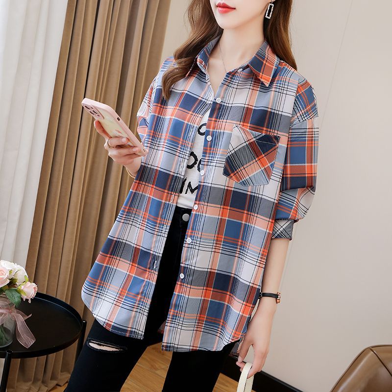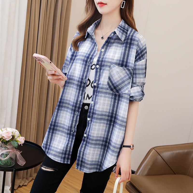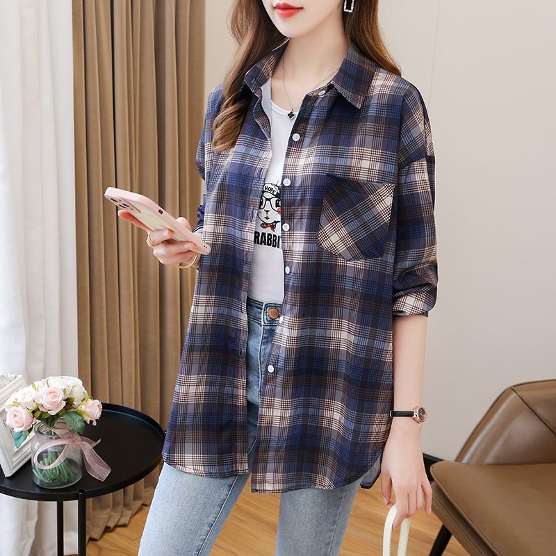 봄과 가을 격자 무늬 셔츠 여성 학생 한국 느슨한 셔츠 캐주얼 bf 스타일 중간 길이 플러스 사이즈 슬림핏 가디건 재킷