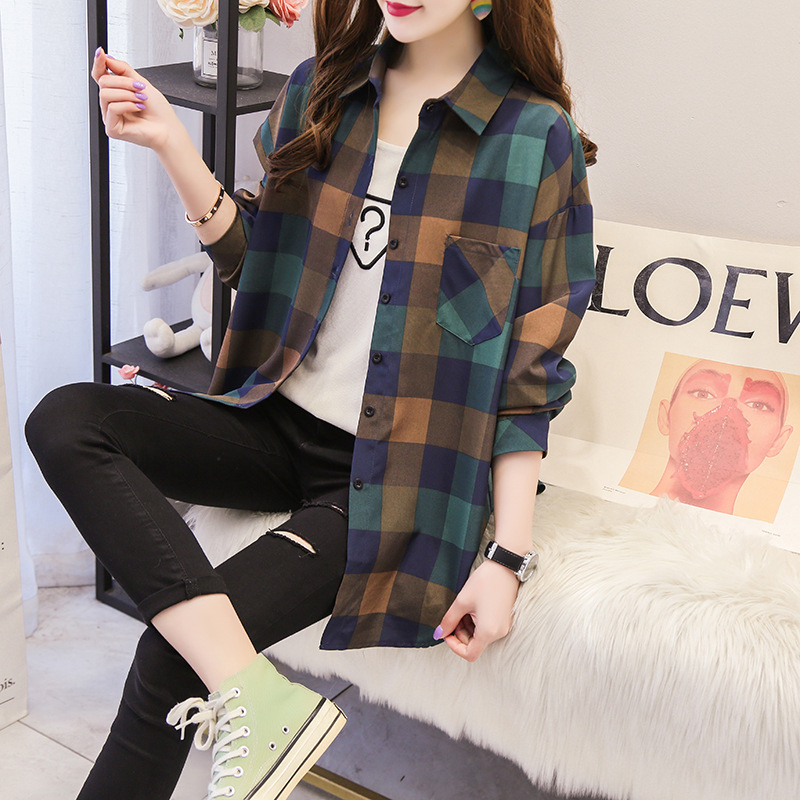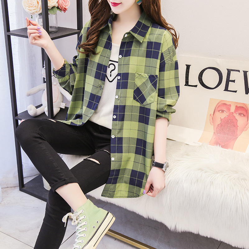 봄과 가을 격자 무늬 셔츠 여성 학생 한국 느슨한 셔츠 캐주얼 bf 스타일 중간 길이 플러스 사이즈 슬림핏 가디건 재킷스토어 가기