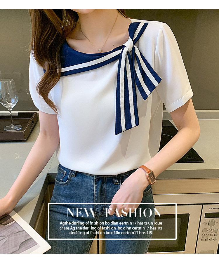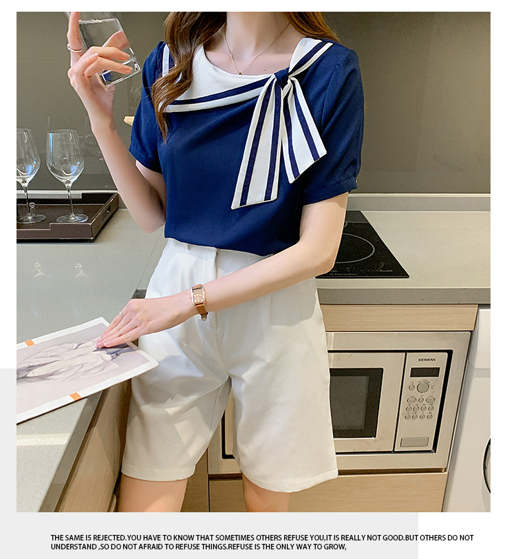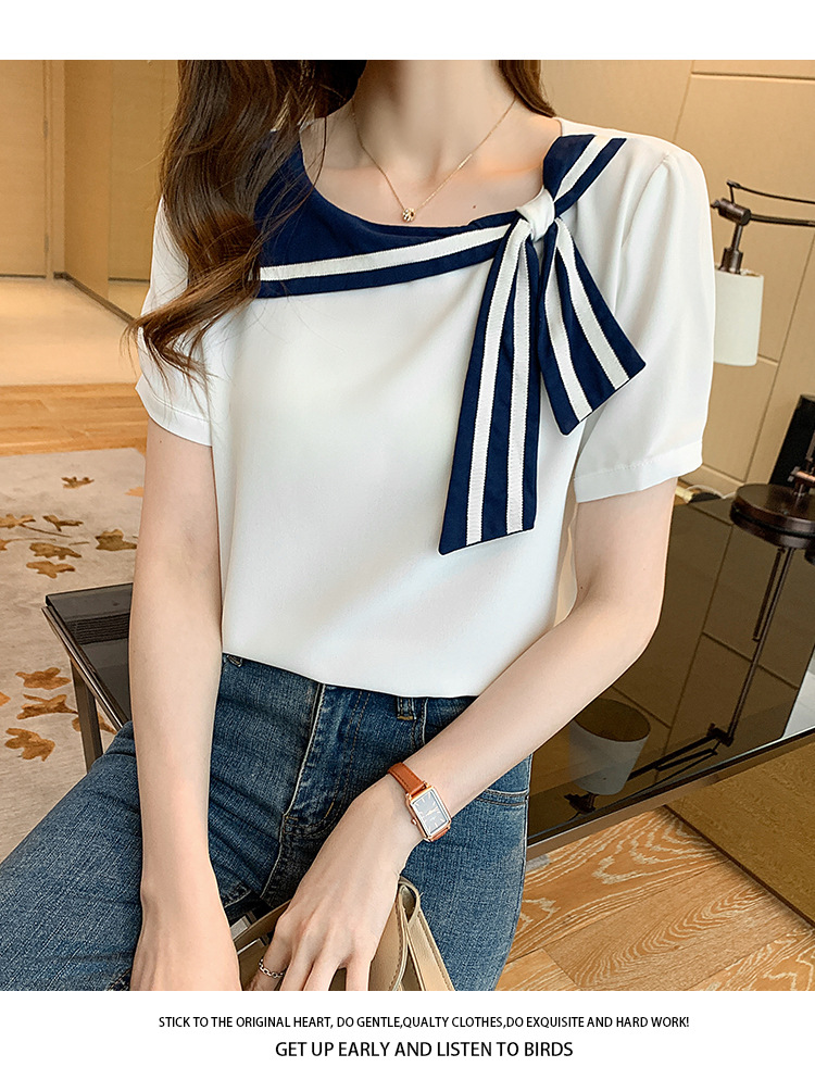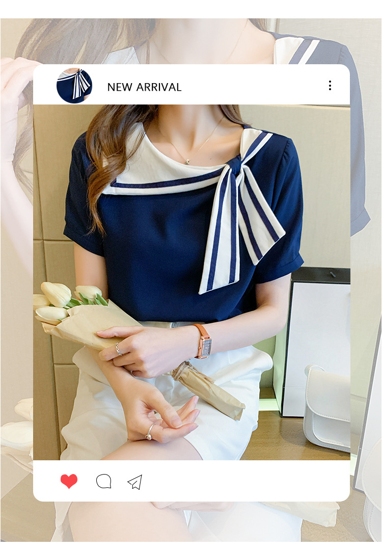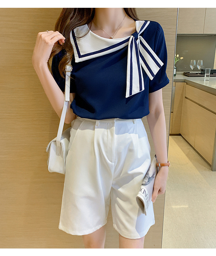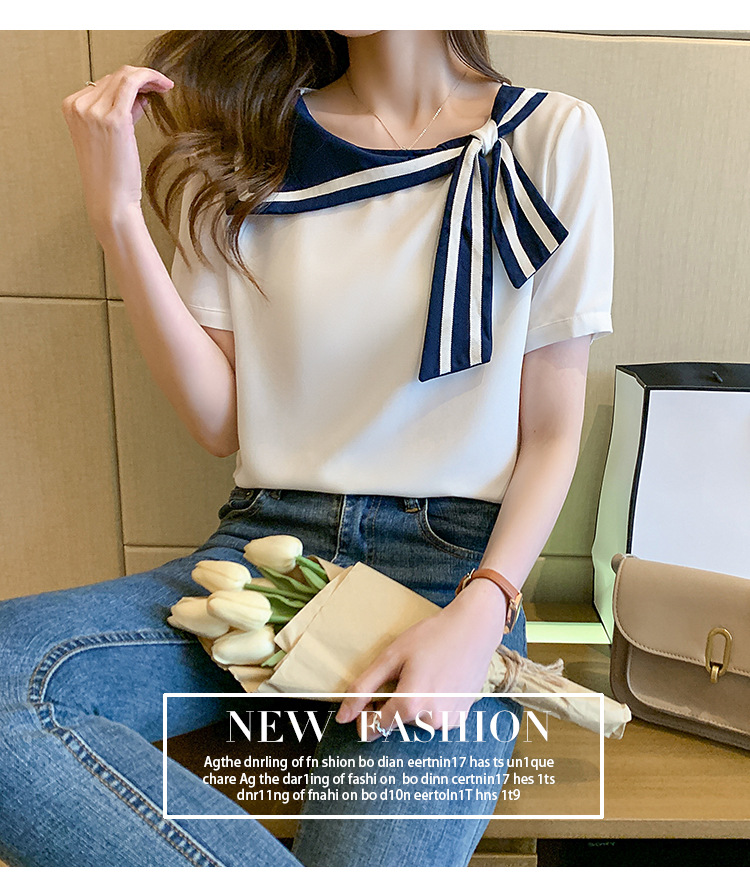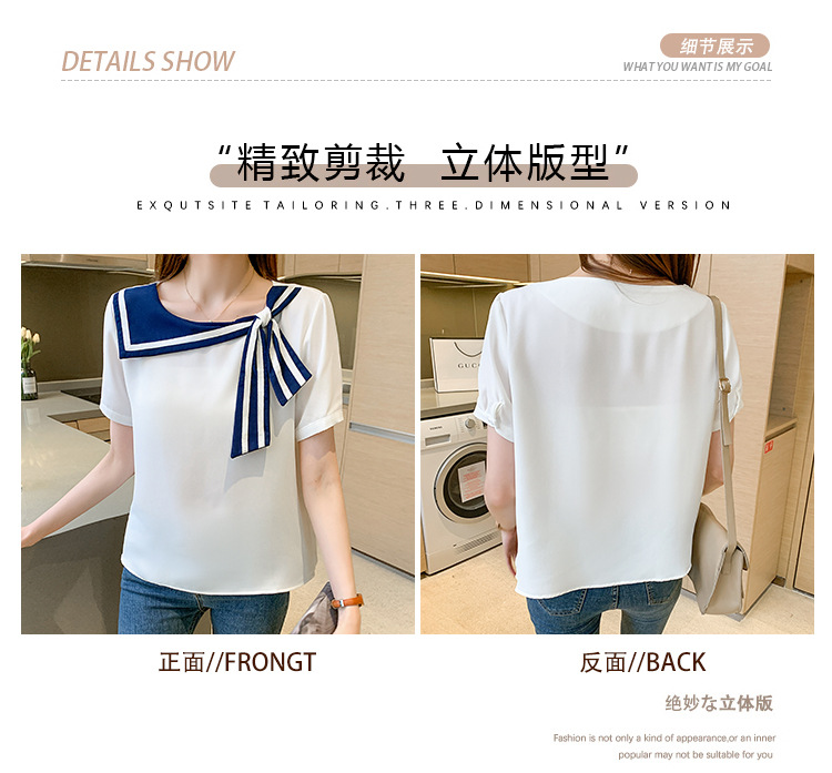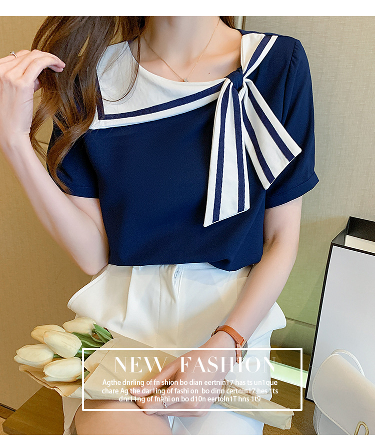 2026년 신상 해군풍 쉬폰 셔츠 여성 반팔 디자인 감각적인 니치 스타일 달콤한 리본 쉬폰 탑스토어 가기