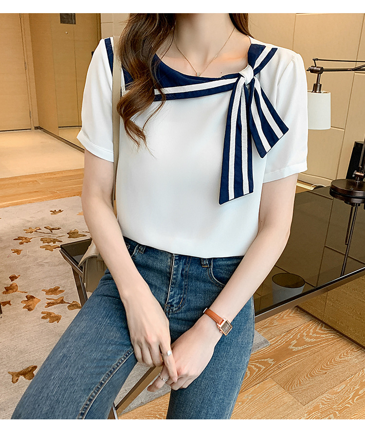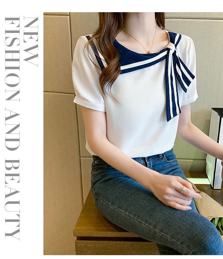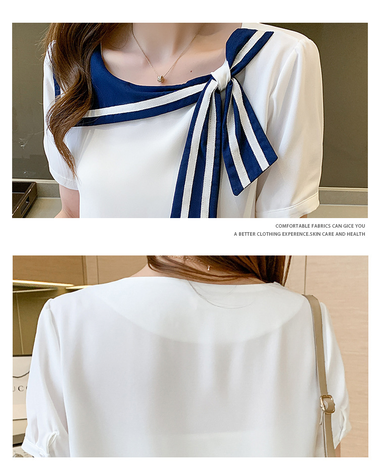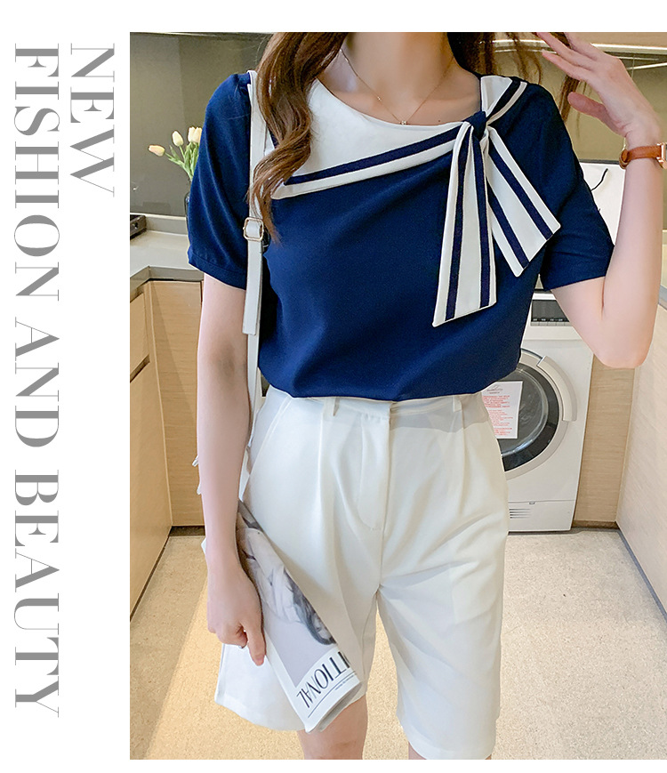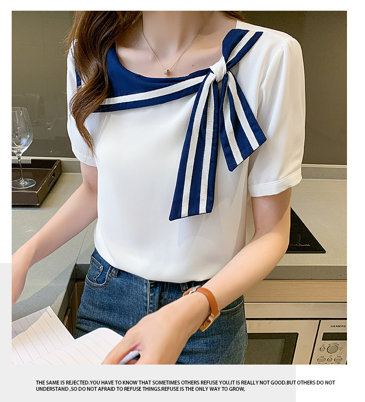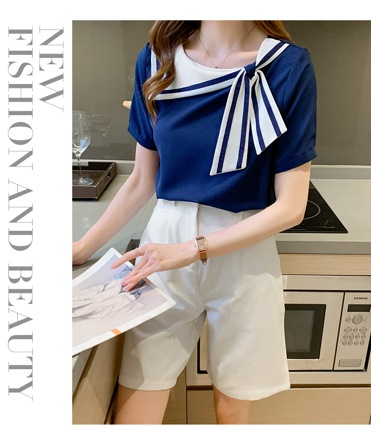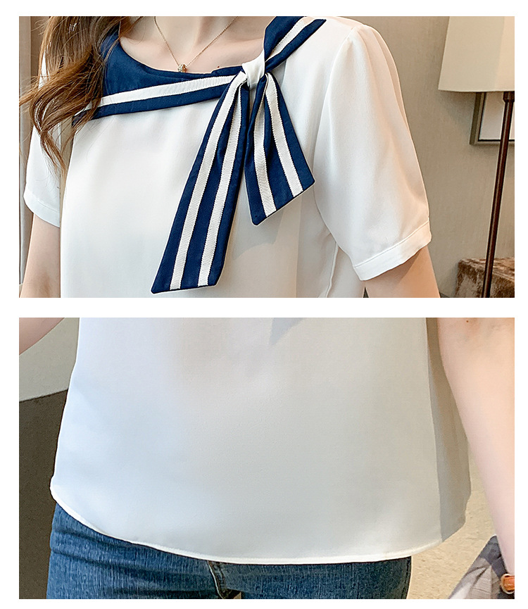 2026년 신상 해군풍 쉬폰 셔츠 여성 반팔 디자인 감각적인 니치 스타일 달콤한 리본 쉬폰 탑스토어 가기