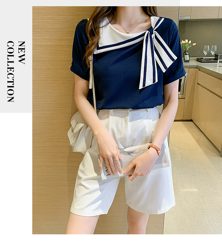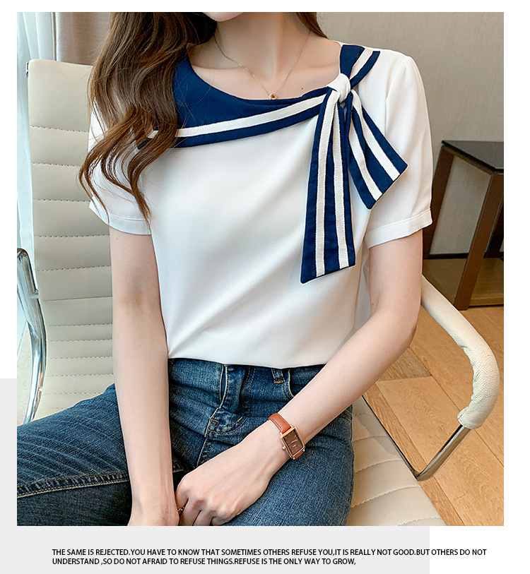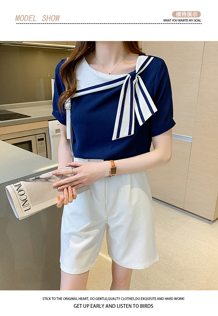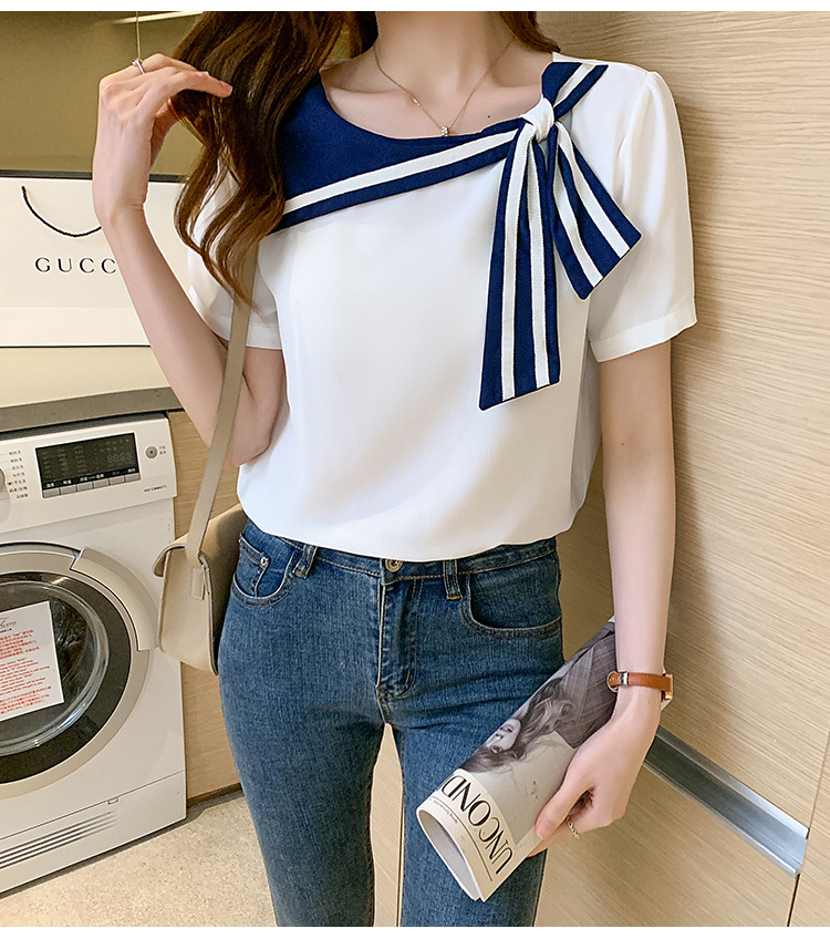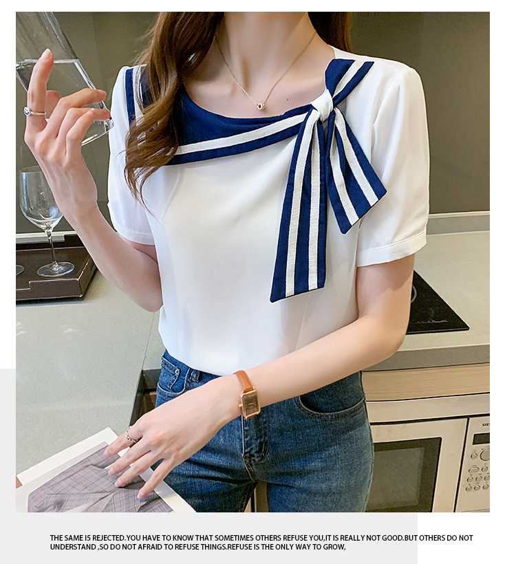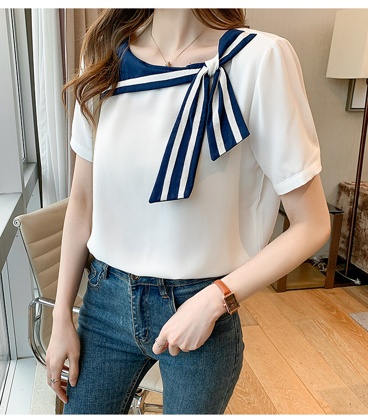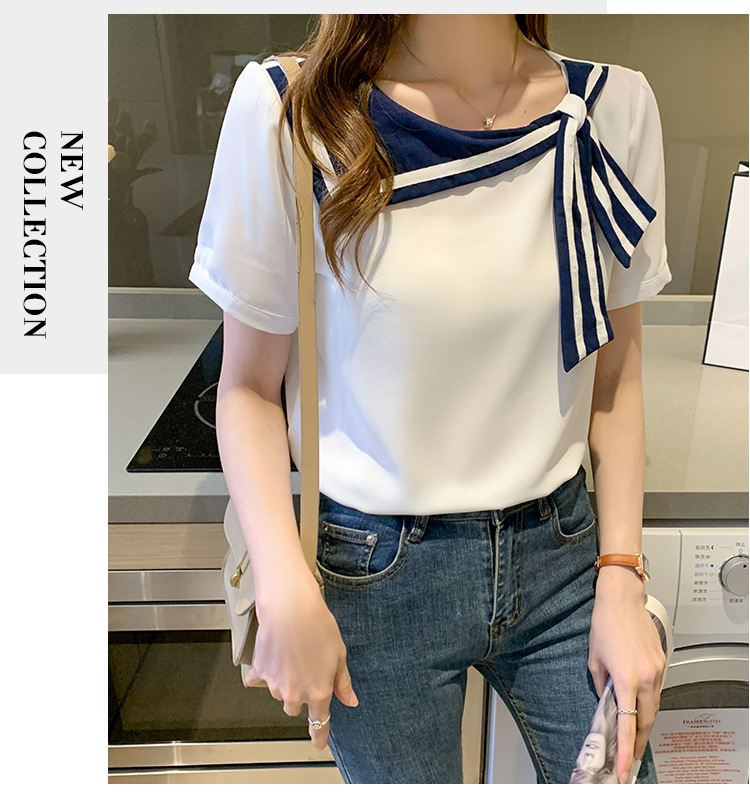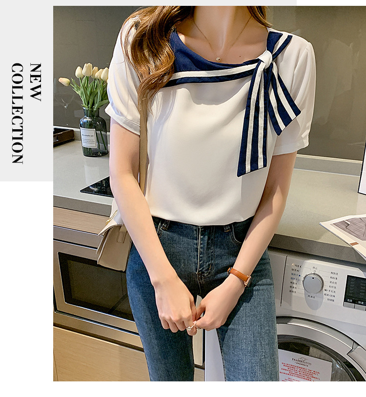2026년 신상 해군풍 쉬폰 셔츠 여성 반팔 디자인 감각적인 니치 스타일 달콤한 리본 쉬폰 탑스토어 가기
