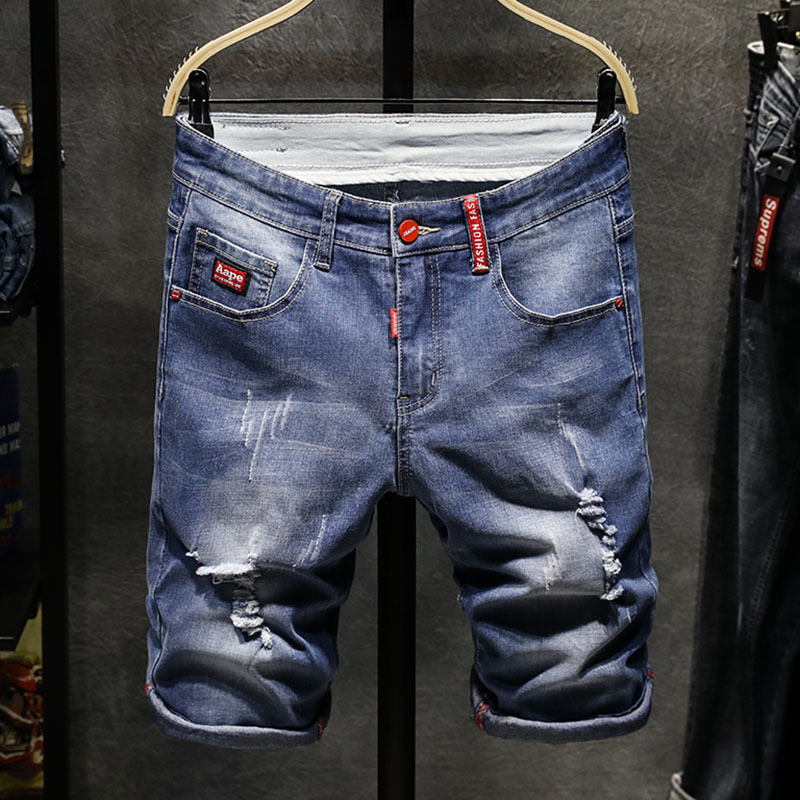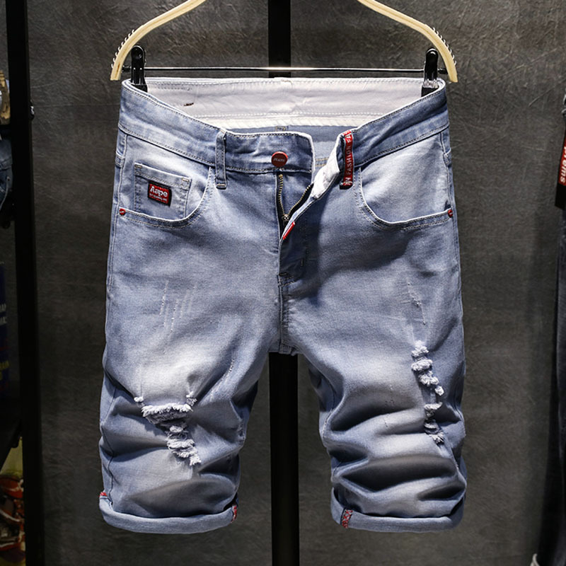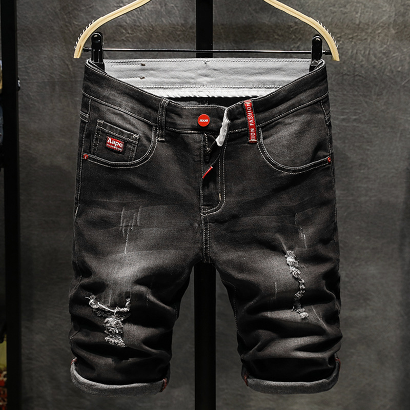 여름 얇은 5 점 바지 남성용 한국식 스트레치 슬림핏 팬츠 청소년 찢어진 반바지 남성용 데님 바지스토어 가기