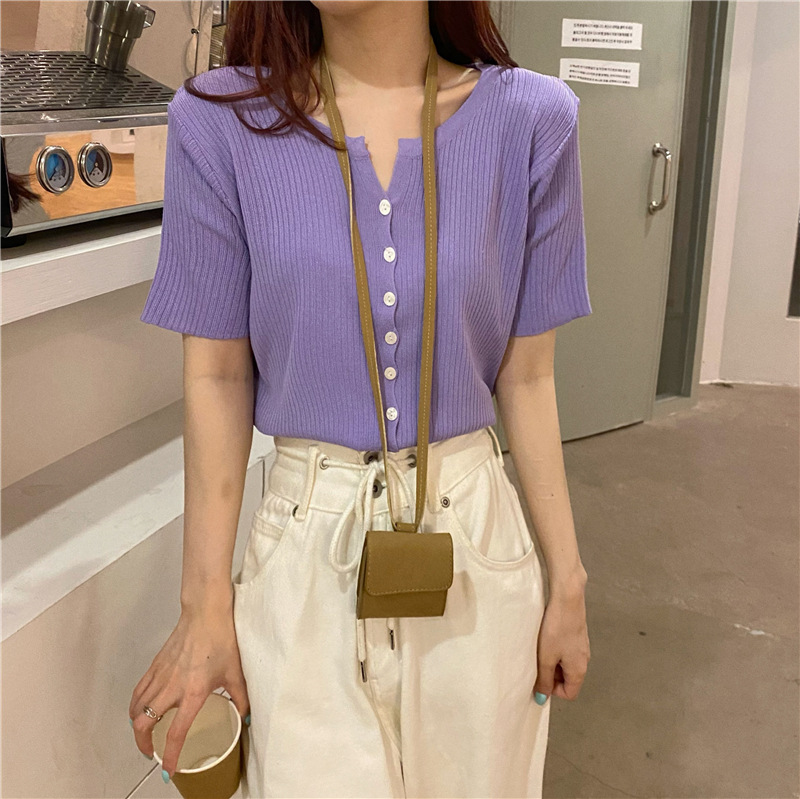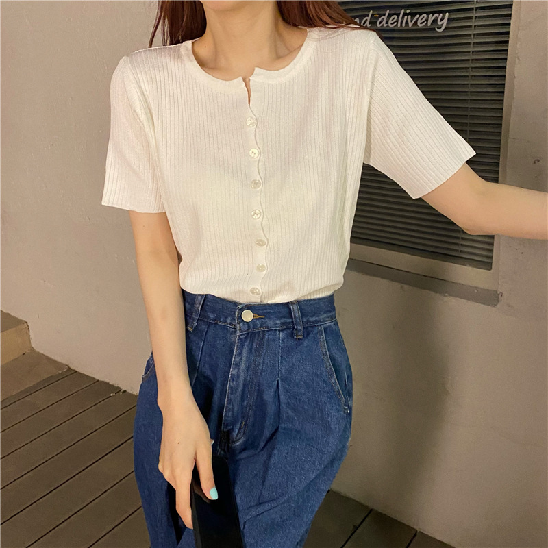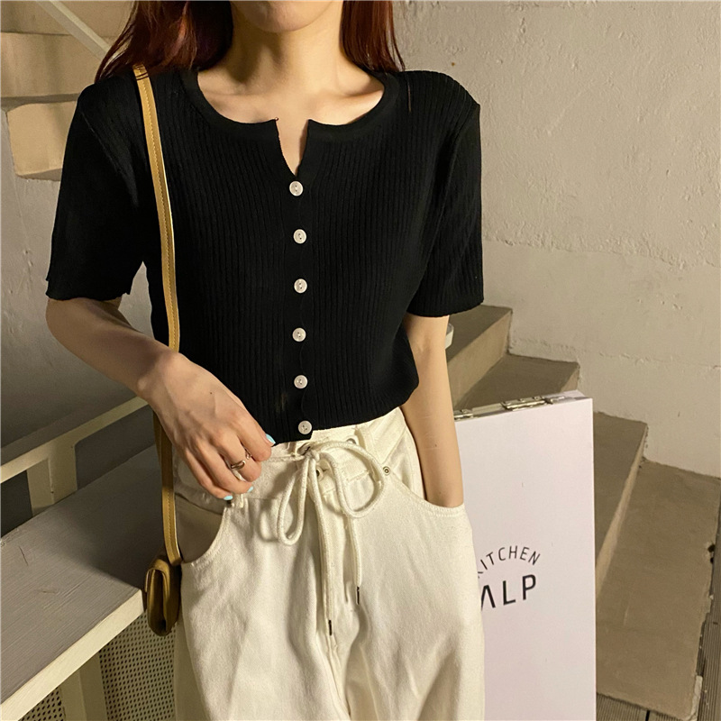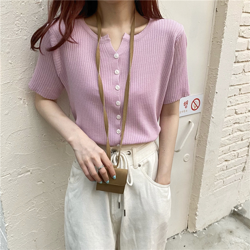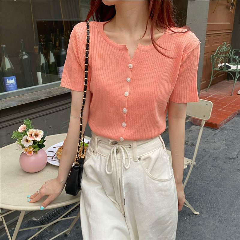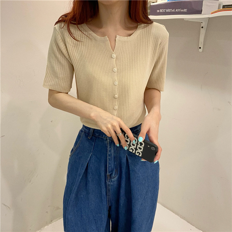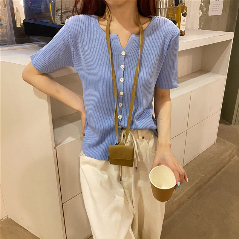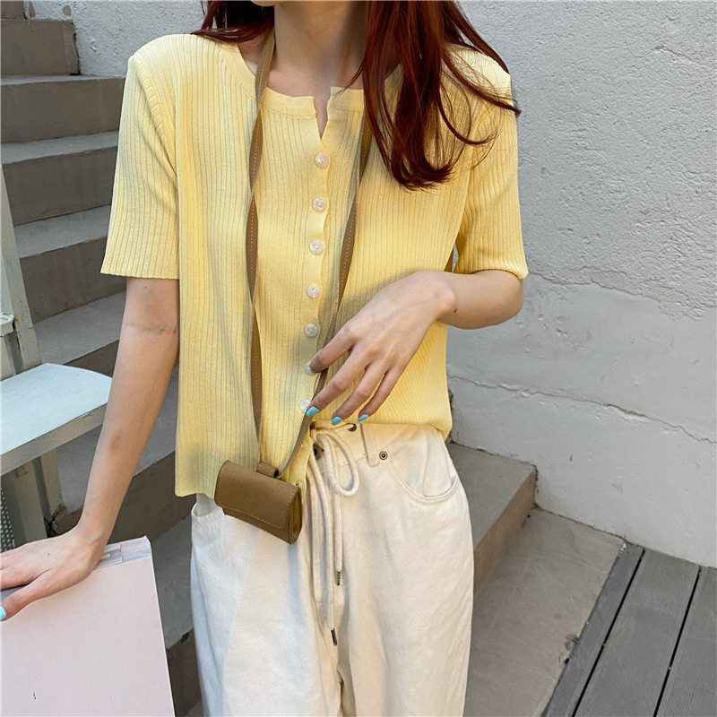 2025년 여름 여성용 신상 니트 스웨터, 한국 스타일의 얇은 베이스 레이어, 단색 슬리밍, 다용도 싱글 브레스트 반팔 탑