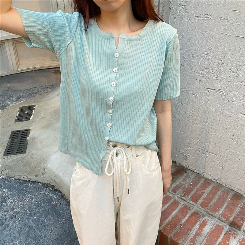 2025년 여름 여성용 신상 니트 스웨터, 한국 스타일의 얇은 베이스 레이어, 단색 슬리밍, 다용도 싱글 브레스트 반팔 탑스토어 가기