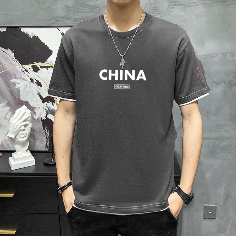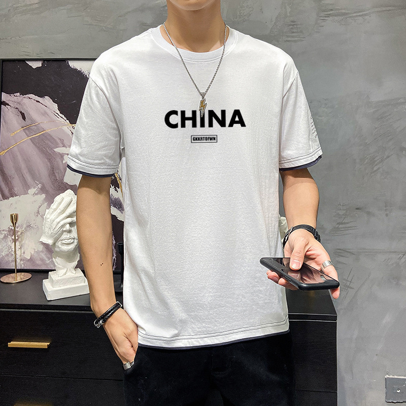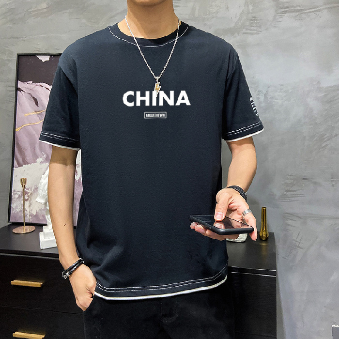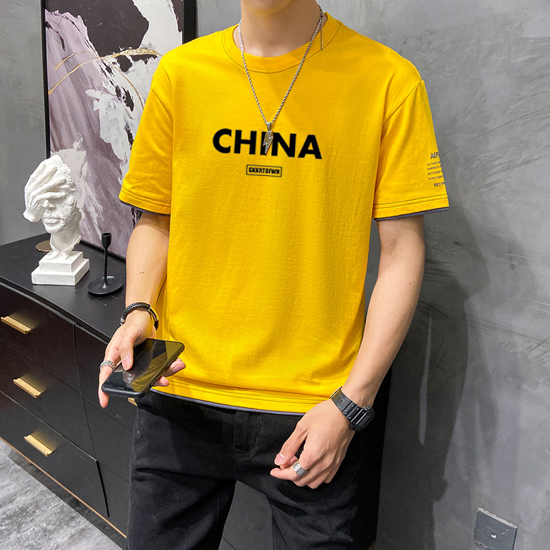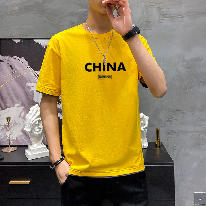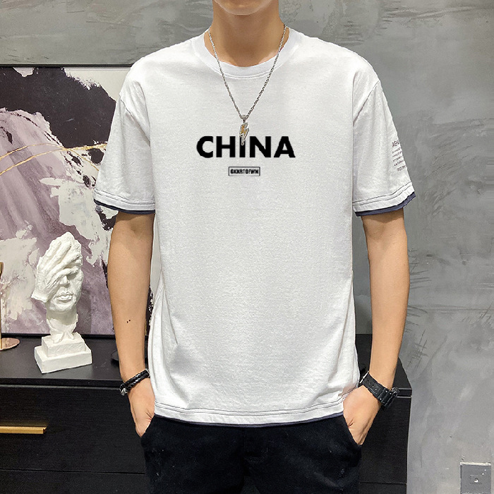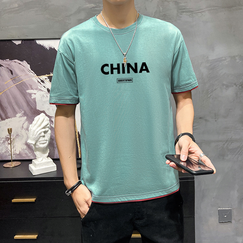 2021 여름 새로운 T 면 느슨한 청소년 반팔 티셔츠 남성용 가짜 투피스 반팔 탑 베이스 셔츠 남성 의류스토어 가기