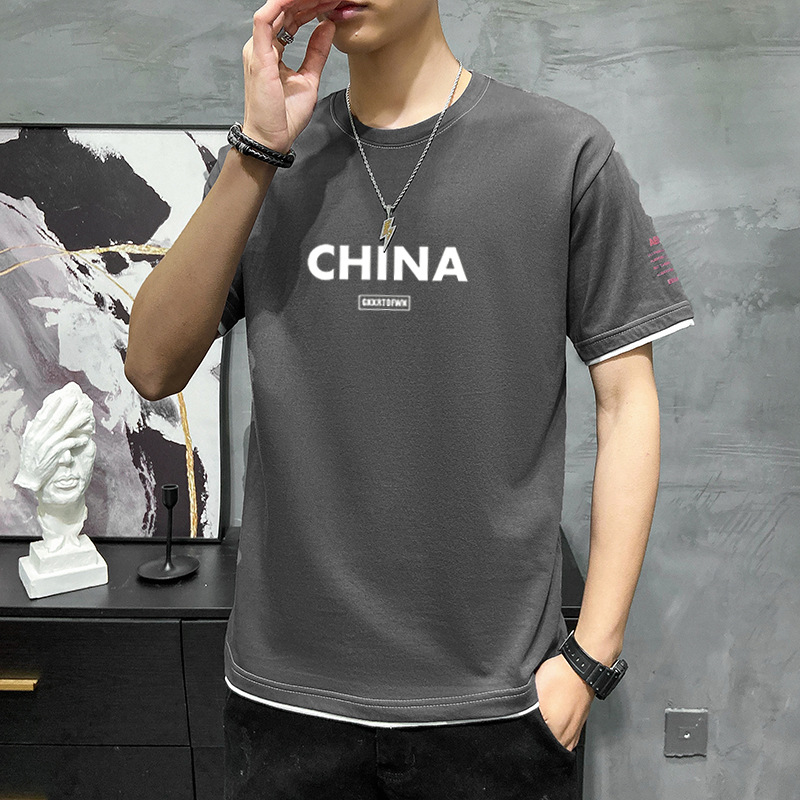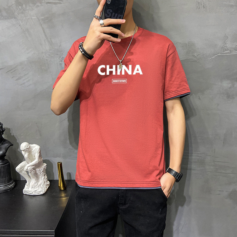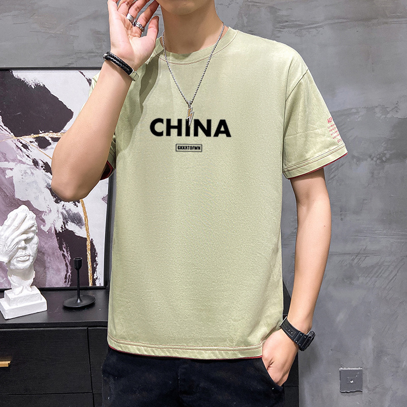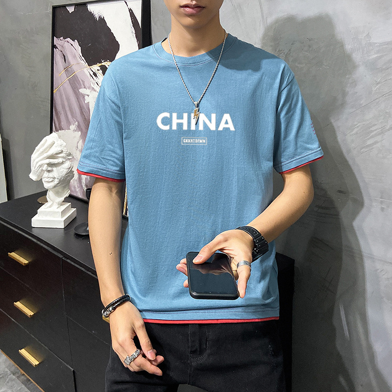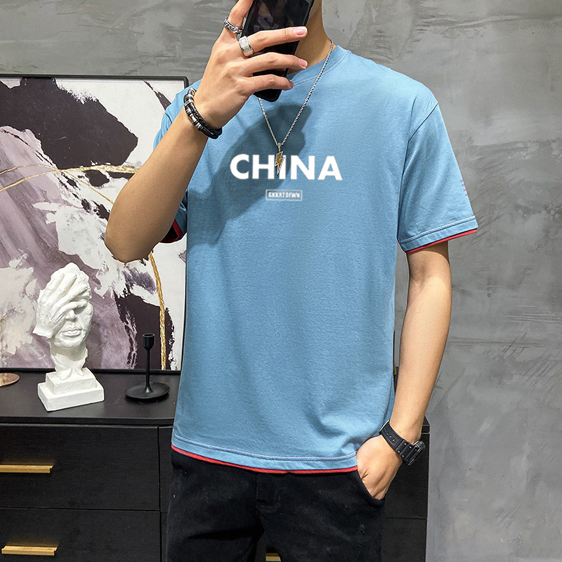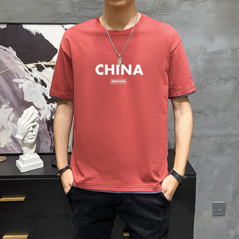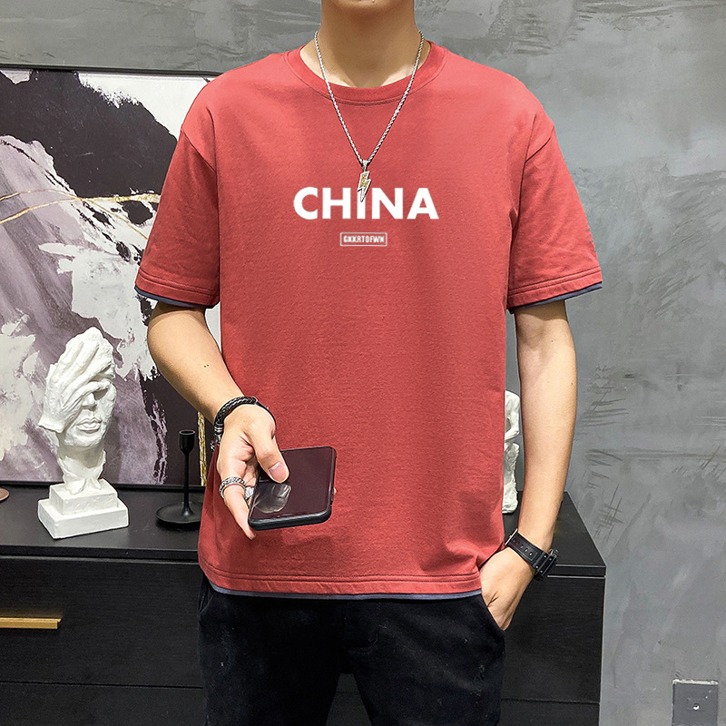 2021 여름 새로운 T 면 느슨한 청소년 반팔 티셔츠 남성용 가짜 투피스 반팔 탑 베이스 셔츠 남성 의류스토어 가기