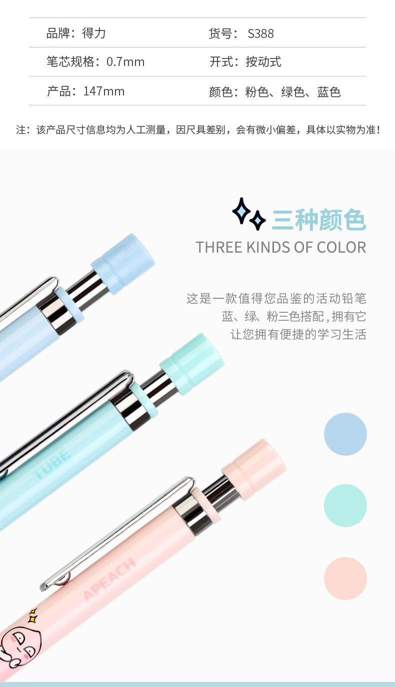 델리 S388 자동 연필 0.7mm 귀여운 창조적 인 경량 자동 연필 학생 컷 프리 쓰기 깨지기 쉽지 않음스토어 가기