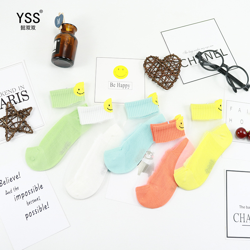 어린이 양말 Yi 쌍 여름 새로운 발 뒤꿈치 만화 스마일 크리스탈 실크 보트 양말 빗질 된 면 바닥 유리 실크 양말