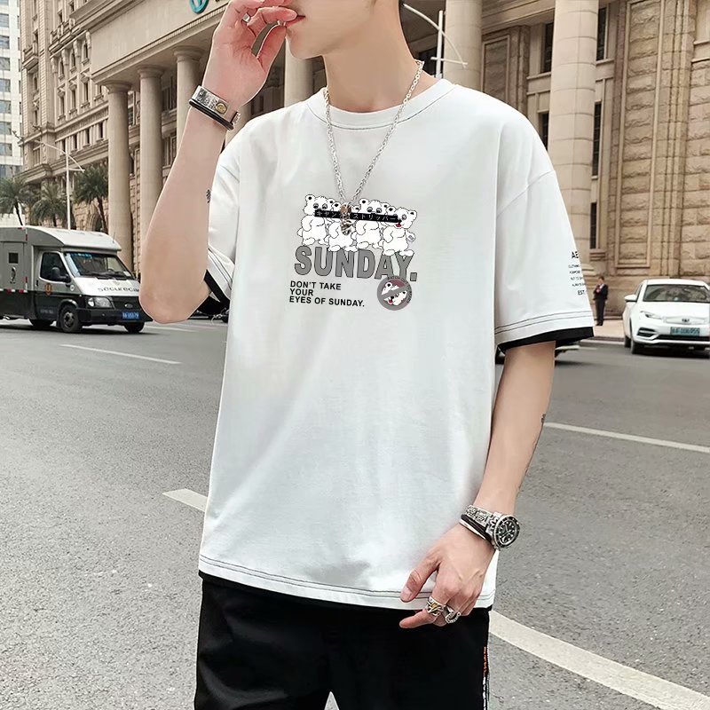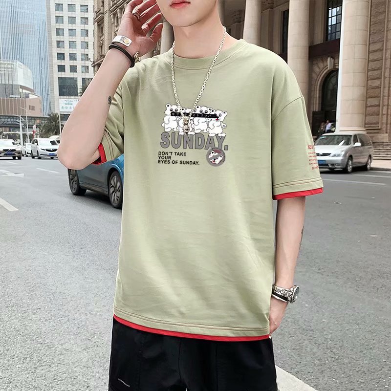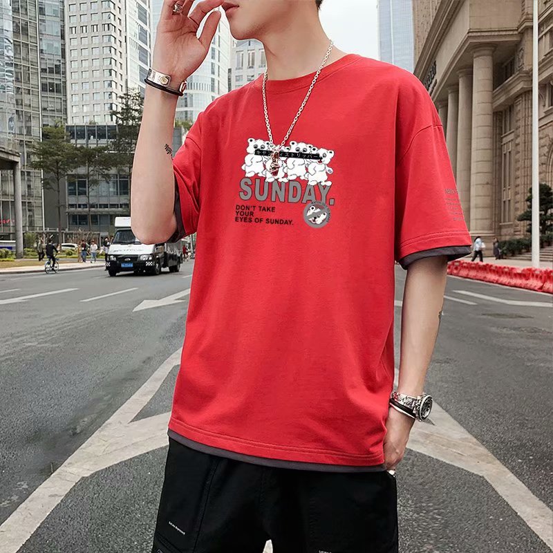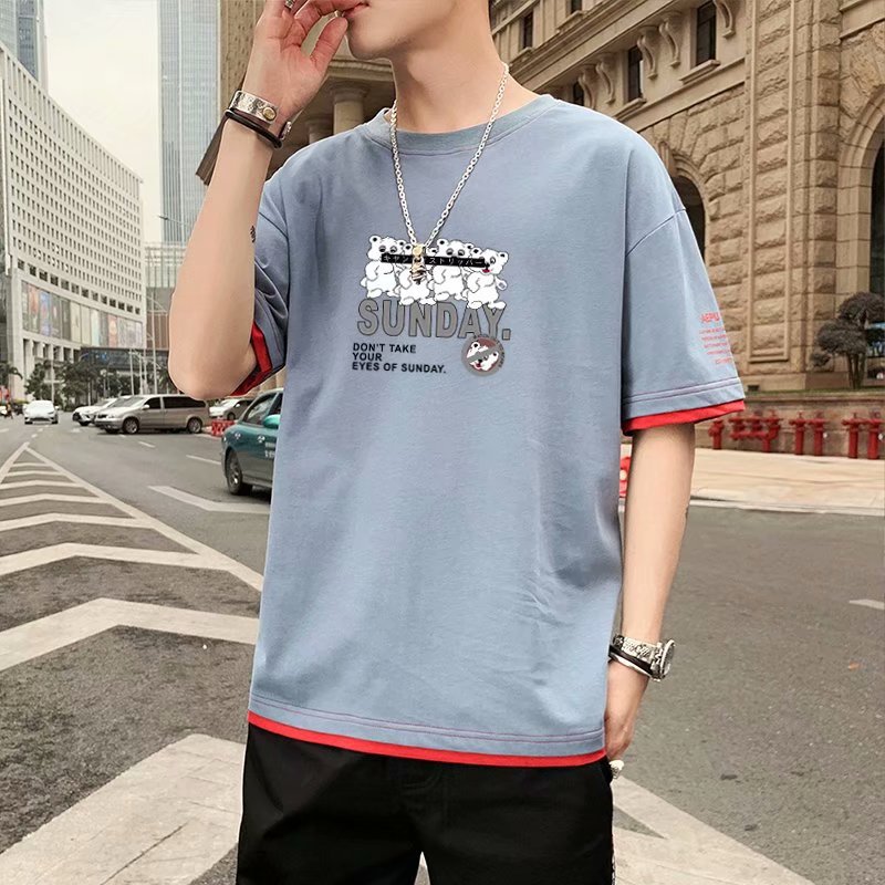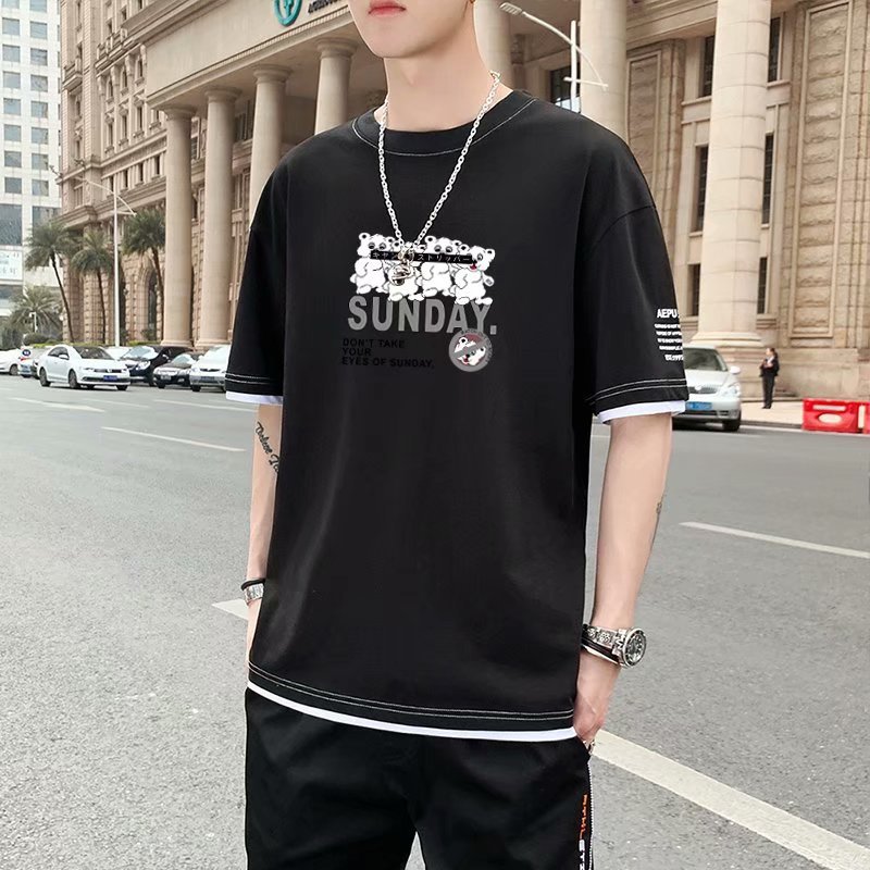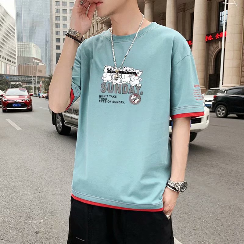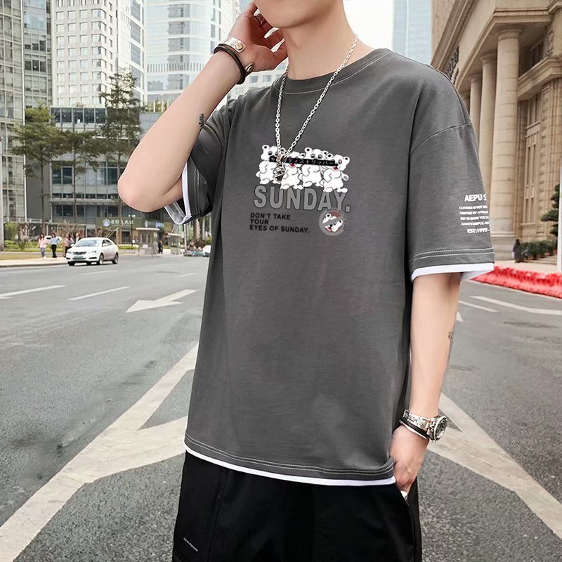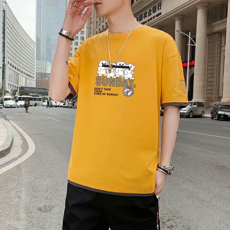 홍콩 스타일 가짜 투피스 C 면 반팔 티셔츠 느슨한 소년 반팔 유행 브랜드 인스 타 그램 스타일 여름 유행 하라주쿠 스타일 반팔 티셔츠스토어 가기