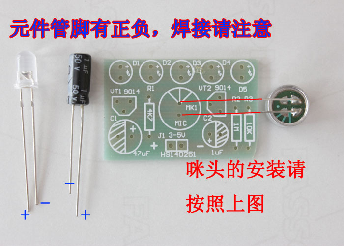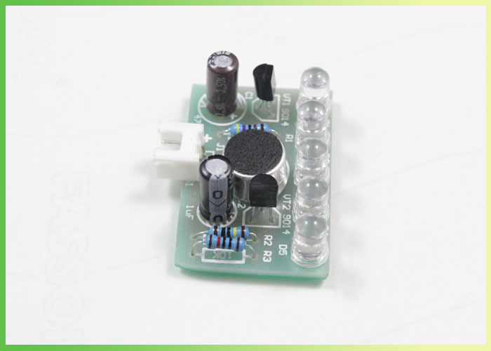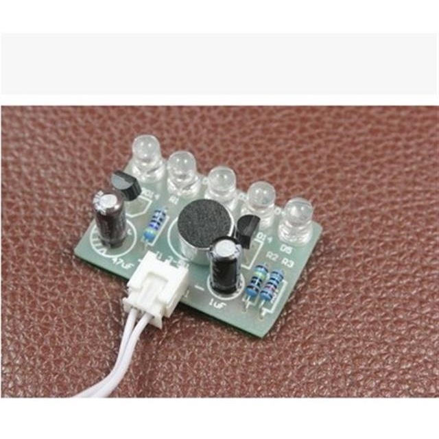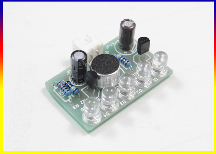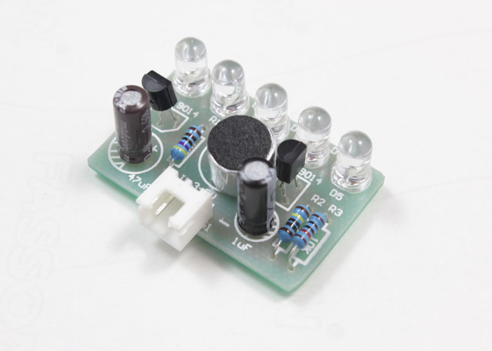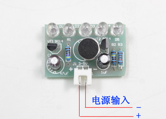 本套件制作成功后5只LED会随着音乐或是其它声音的节奏闪动起来,可放置于音响附近,让灯光为音乐伴舞!