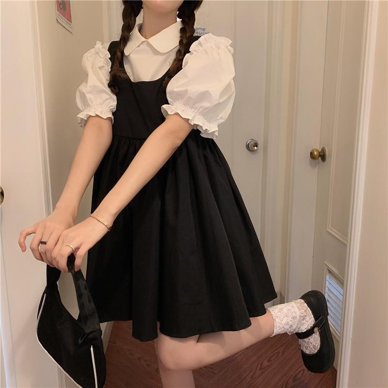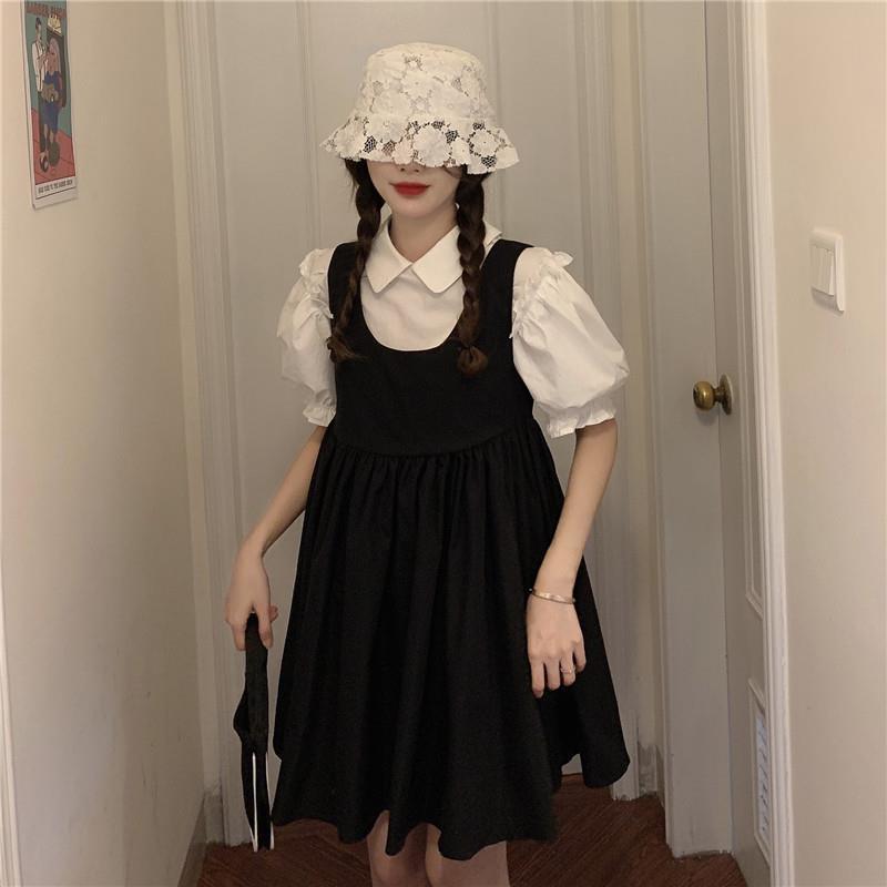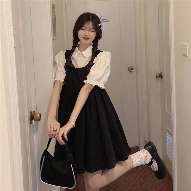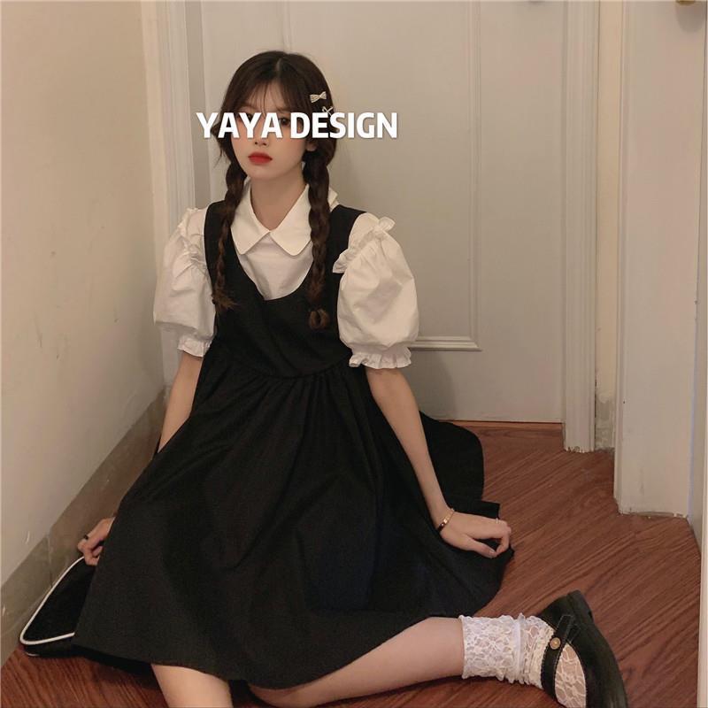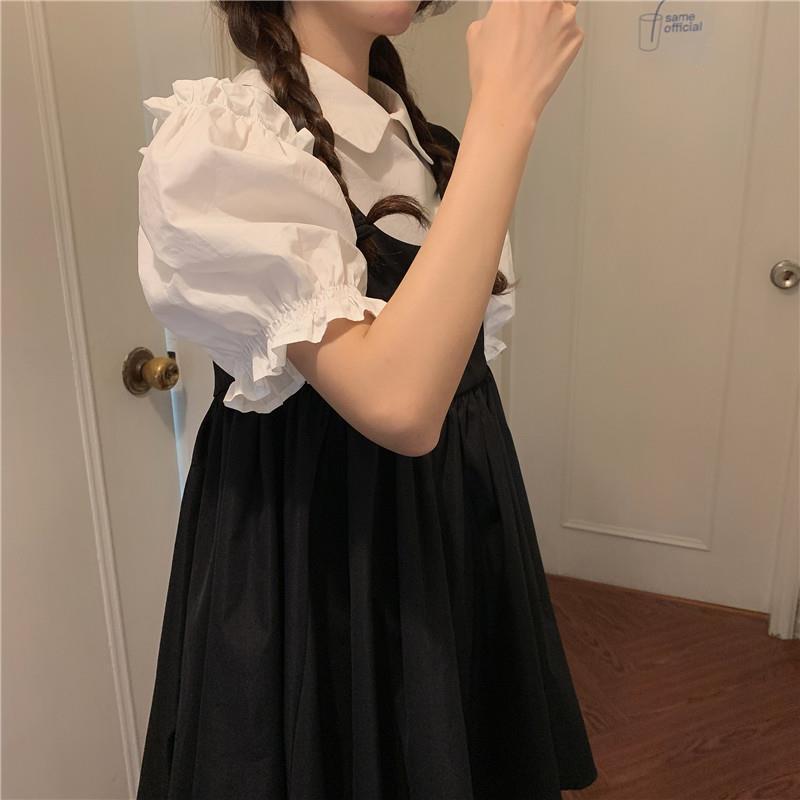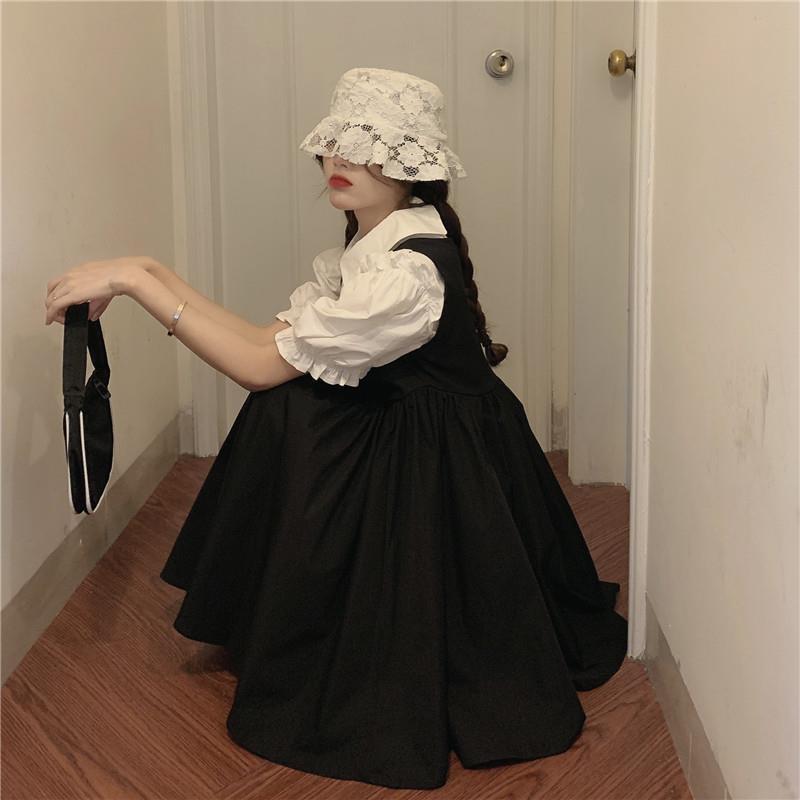 프랑스 공주 원피스 세트 퍼프 슬리브 우아한 레이스 셔츠 스트랩 원피스 조끼 원피스 달콤한 투피스 세트스토어 가기