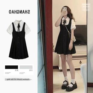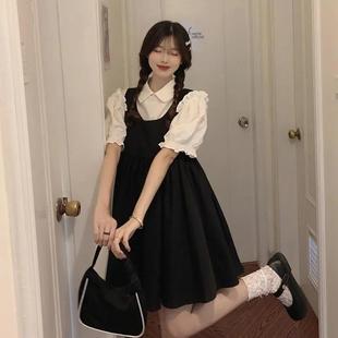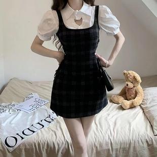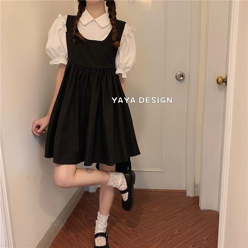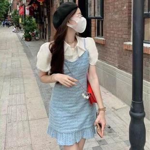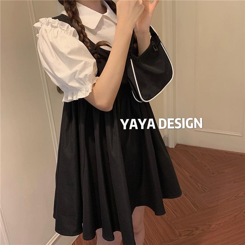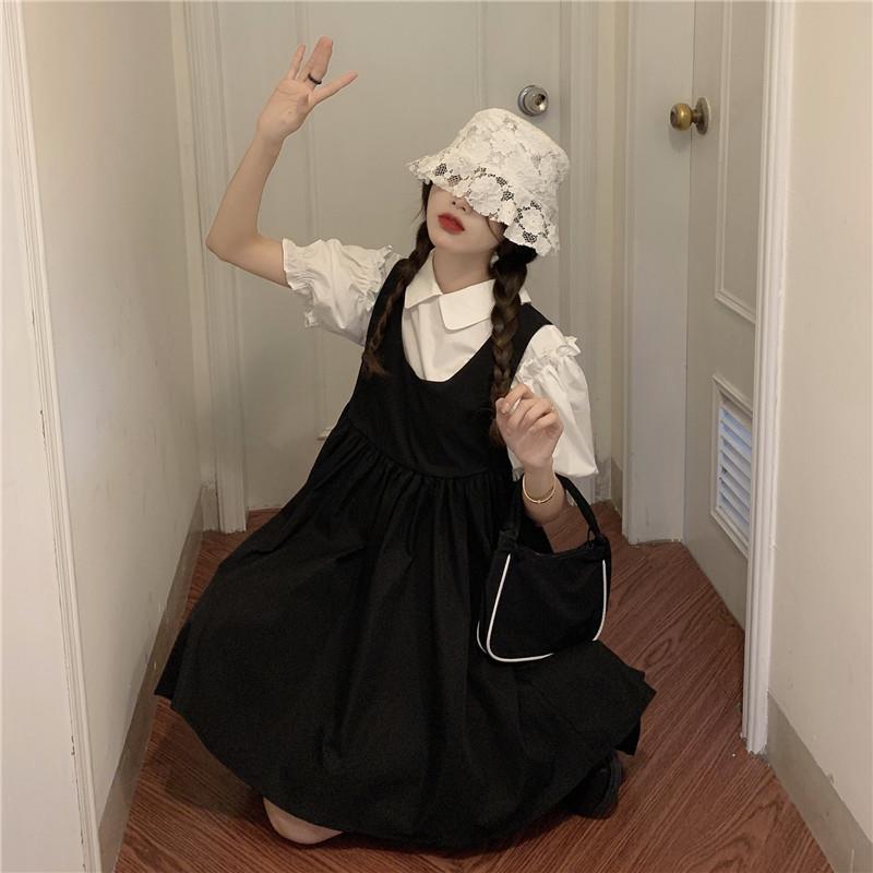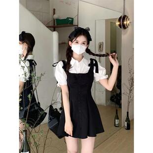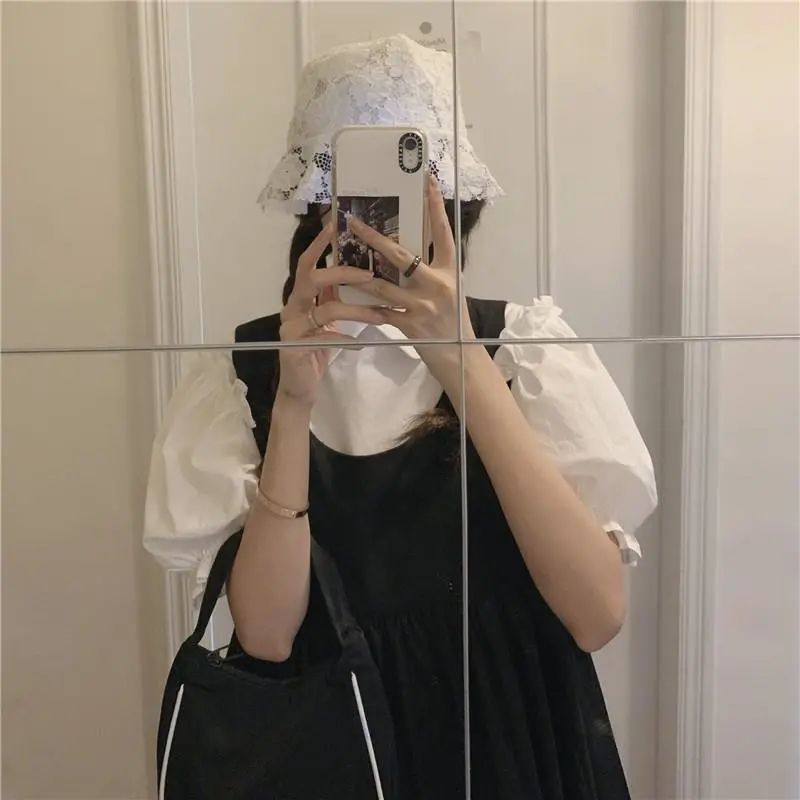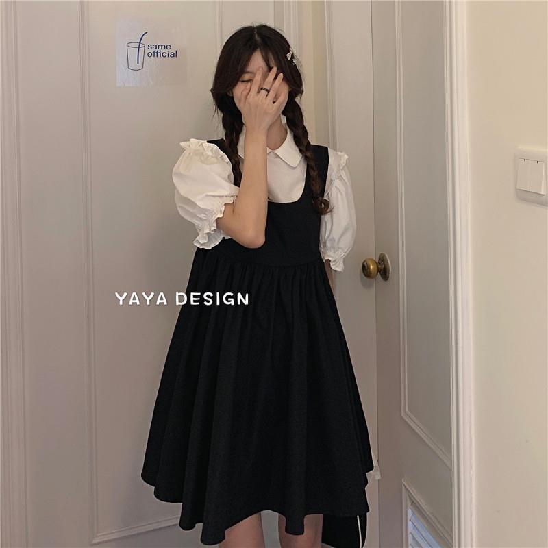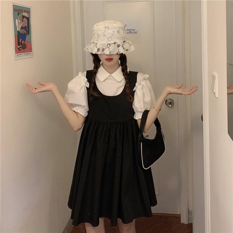 프랑스 공주 원피스 세트 퍼프 슬리브 우아한 레이스 셔츠 스트랩 원피스 조끼 원피스 달콤한 투피스 세트스토어 가기