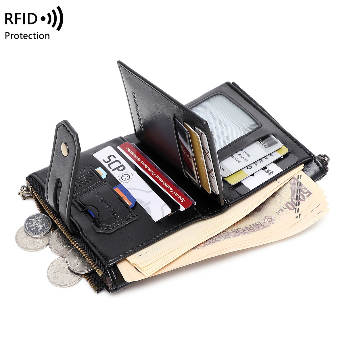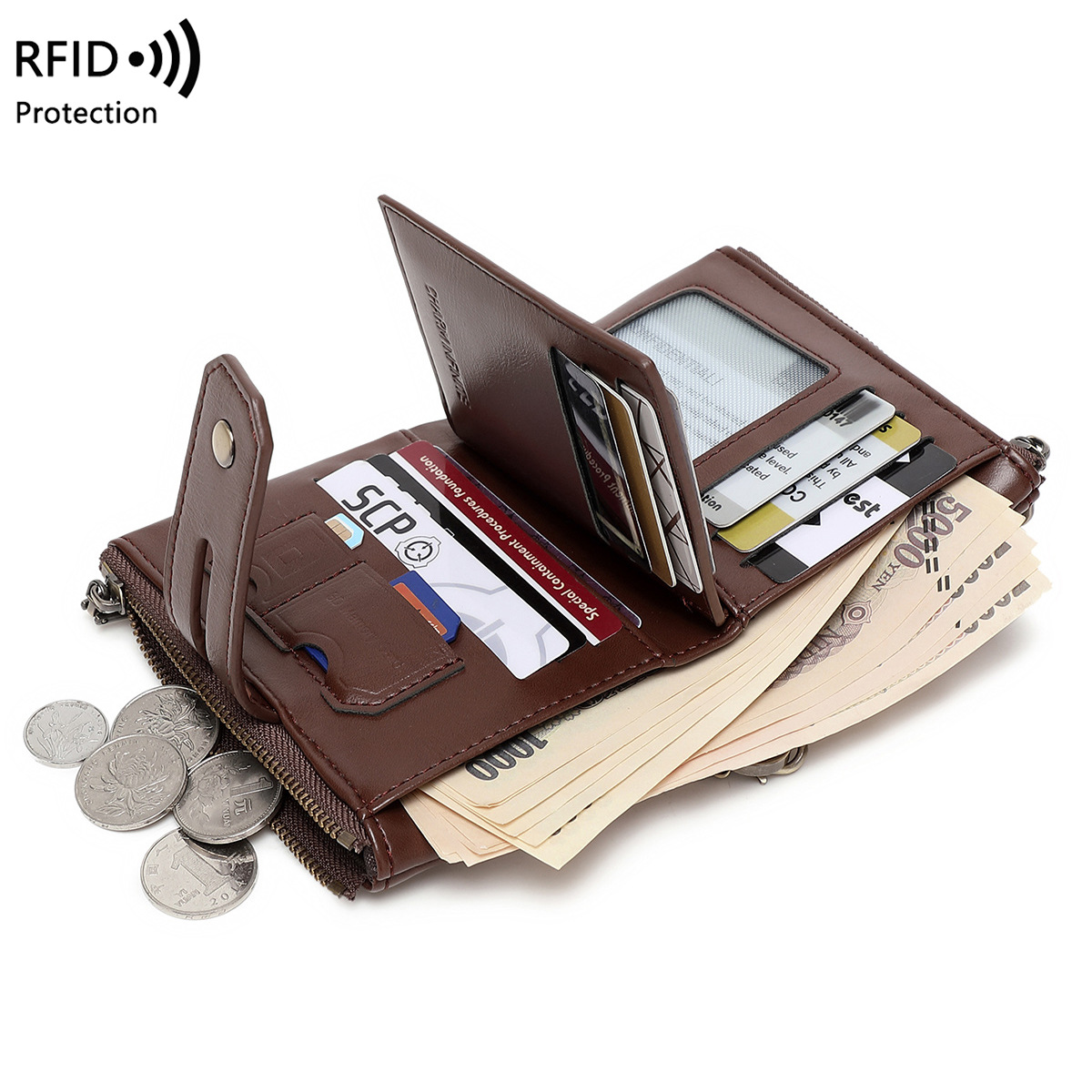 크로스보더 남성용 지갑 레트로 스타일 지퍼형 숏지갑 다기능 대용량 체인 카드홀더 도난방지 동전지갑