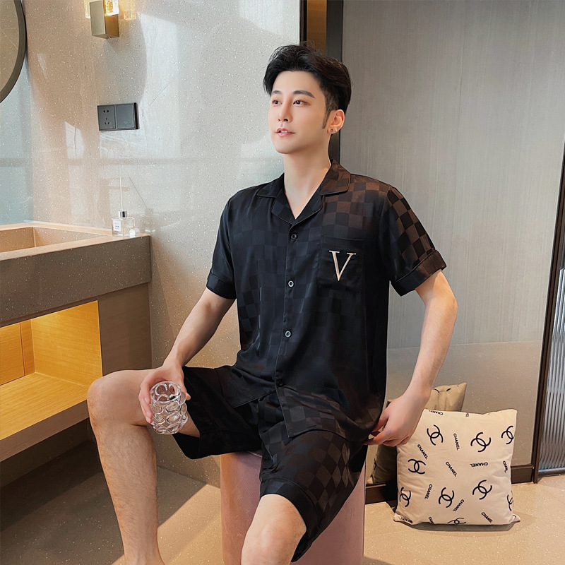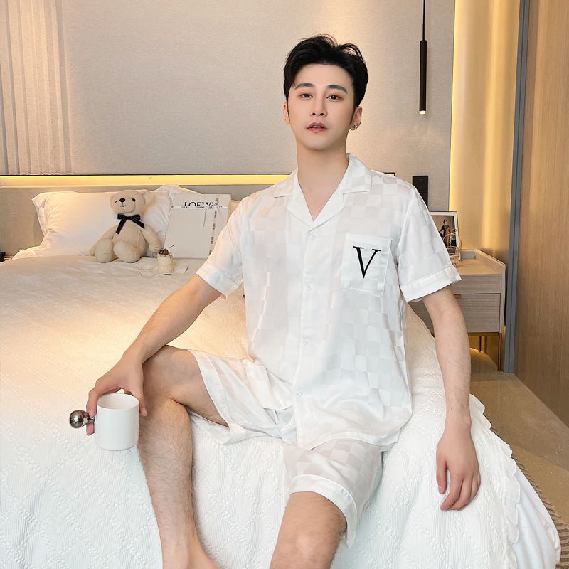 커플 잠옷 여성용 한국식 자카드 격자 무늬 아이스 실크 반팔 세트 남성용 얇은 카디건 느슨한 가정복 여름