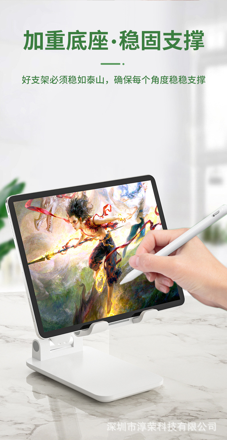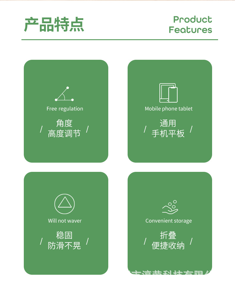 产品特色:双折叠升降,任意角度调节、可完全收纳携带方便,支持ipad摆放,稳固不倒!