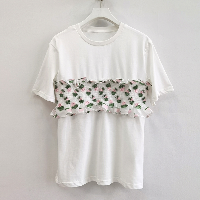 2021 봄 여름 신상 꽃무늬 배색 루즈핏 풀오버 라운드넥 면 티셔츠 여성용 트렌디 반팔 플로럴스토어 가기
