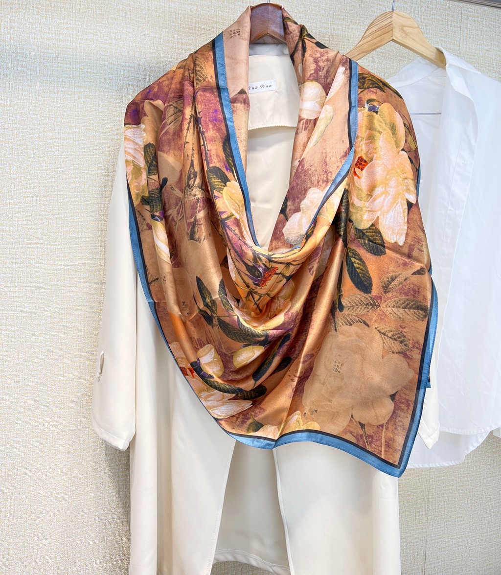 斜纹真丝!法式山茶花桑蚕丝丝巾女春秋季斜纹绸大方巾围巾披肩