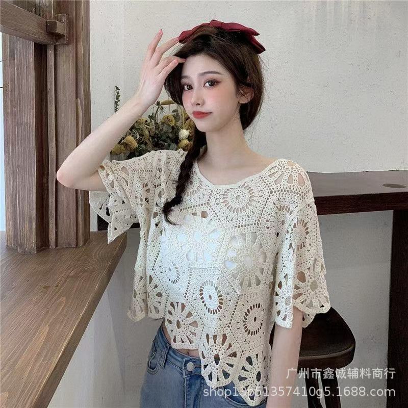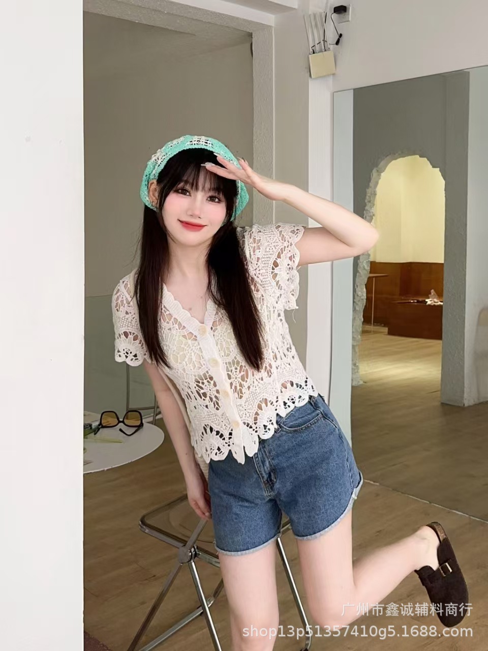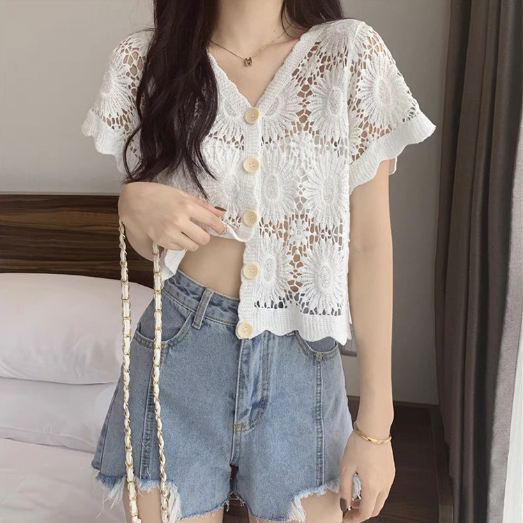 쇼트 탑 여성의 봄과 여름 틈새 새로운 패션 시대 감소 V 넥 할로우 에어컨 니트 셔츠 긴 소매 카디건 재킷스토어 가기