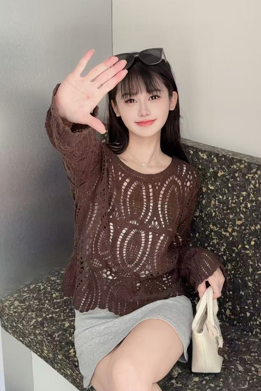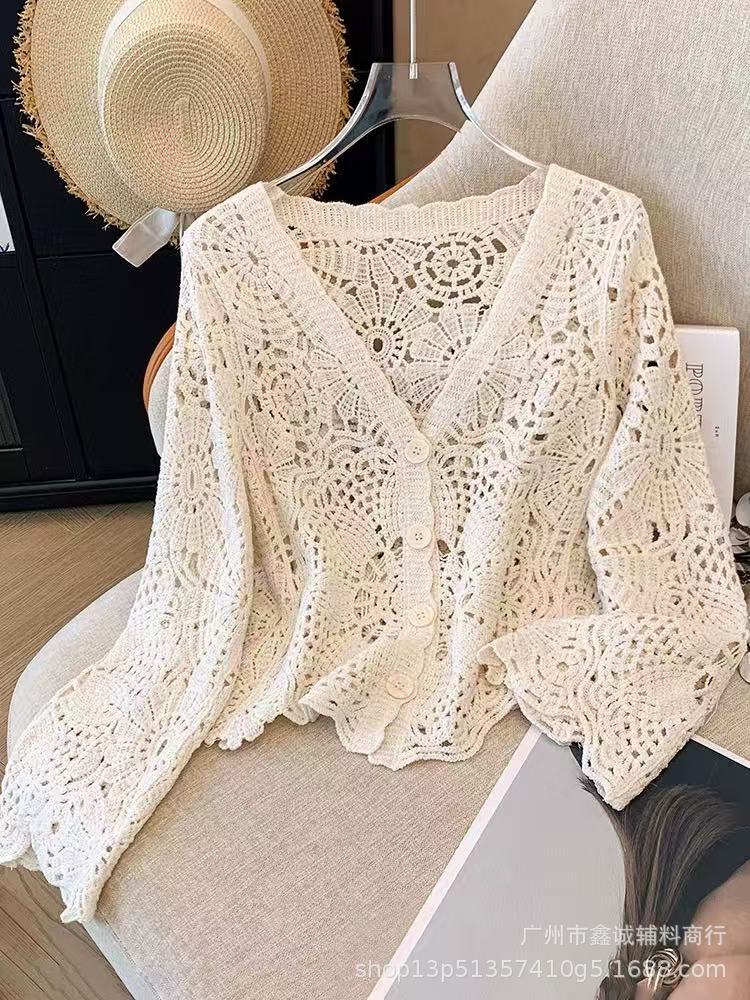 쇼트 탑 여성의 봄과 여름 틈새 새로운 패션 시대 감소 V 넥 할로우 에어컨 니트 셔츠 긴 소매 카디건 재킷