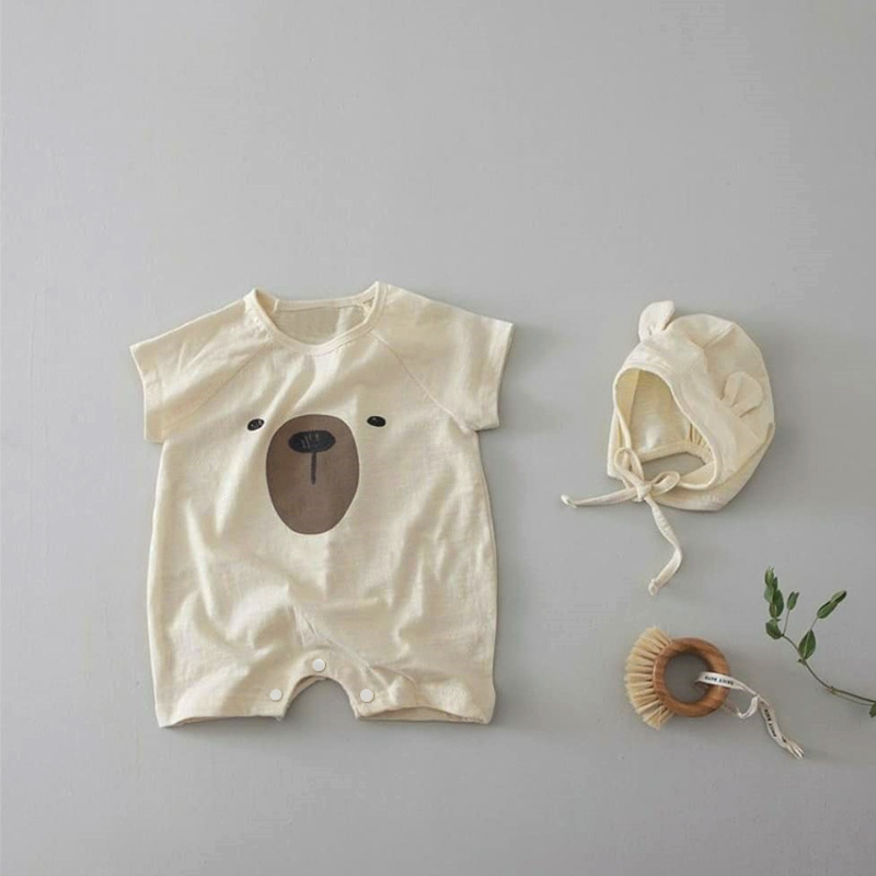 곰 프린트 오픈 가랑이 romper 아기 점프 슈트 여름 신생아 옷 반팔 아기 여름 후드
