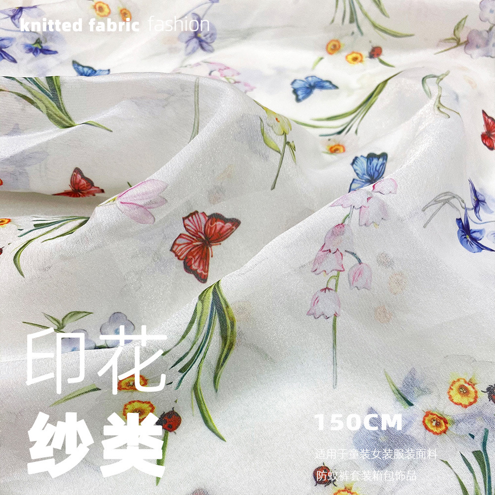 봄과 여름 꽃 인쇄 직물 고급 플래시 오간자 쉬폰 나비 인쇄 원피스 캐미솔 Hanfu 직물스토어 가기