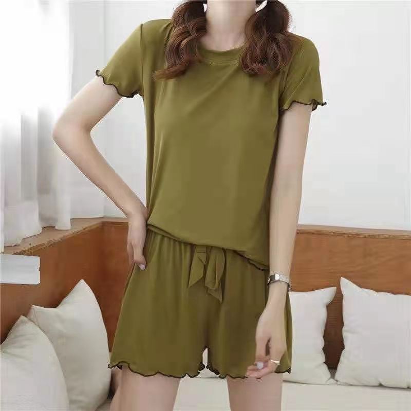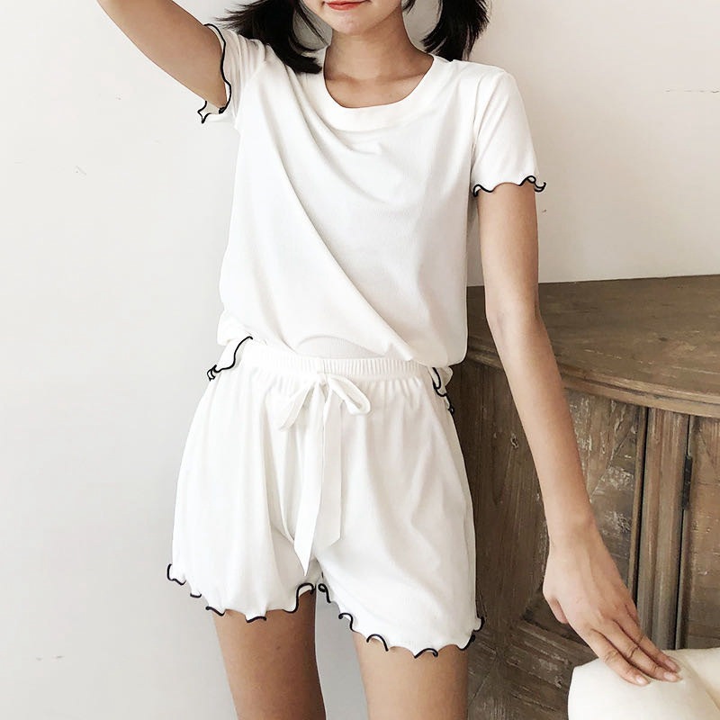 2021 여름 귀 가장자리 쿨 세트 아이스 실크 스레드 잠옷 캐주얼 홈 옷 둥근 목 짧은 소매 반바지 투피스 세트