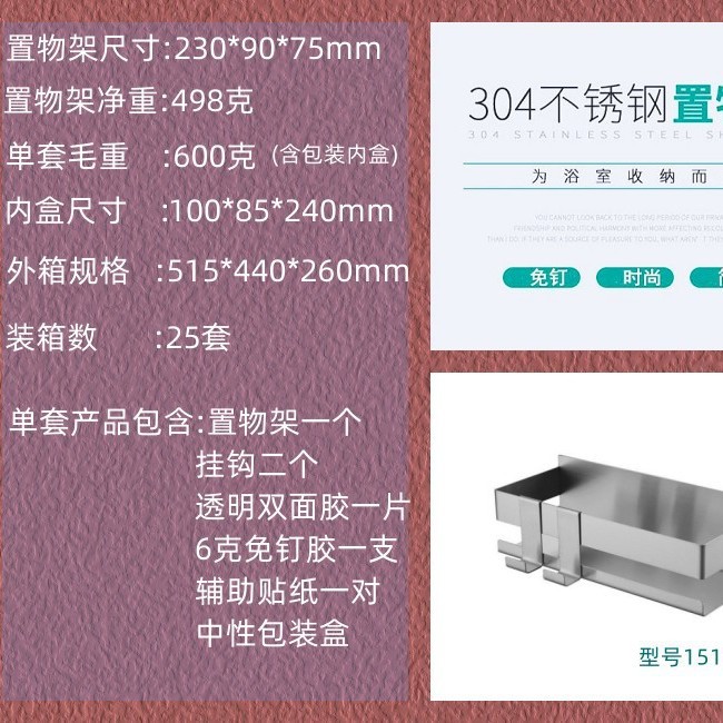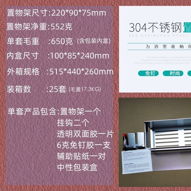 304不锈钢置物架库存现货常规库存有22CM ,23CM和30CM等长度,此连接中置物架常规配套2个挂钩,需要多配或不要挂钩的亲亲,下单前联系客服沟通清楚喔!更多规格或款式欢迎来图来样订做,量大价优.单款式起订量200套(含)以上,免收模具费用.购买现货的亲,请自己查证这款式能否适合你的销售市场。建议订制合适自己需求的规格。