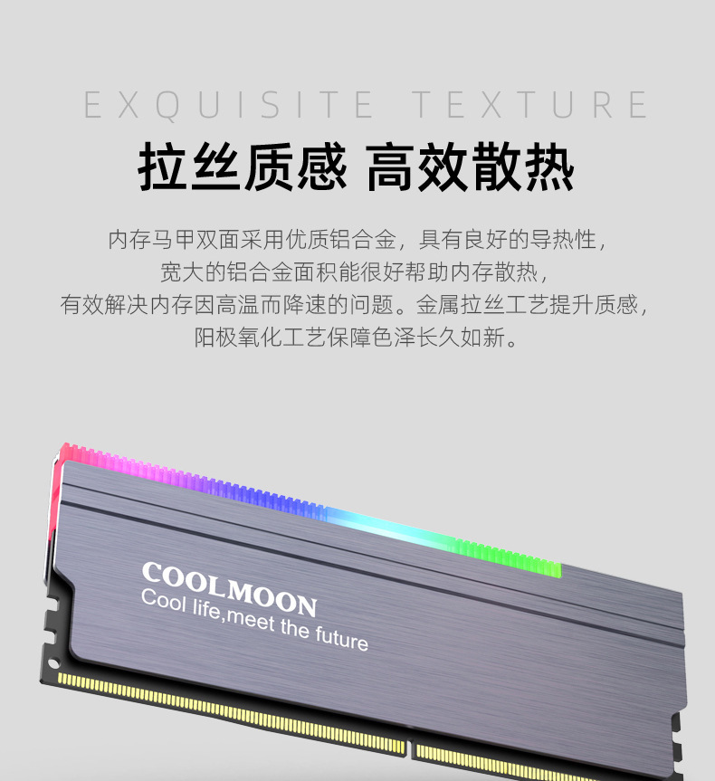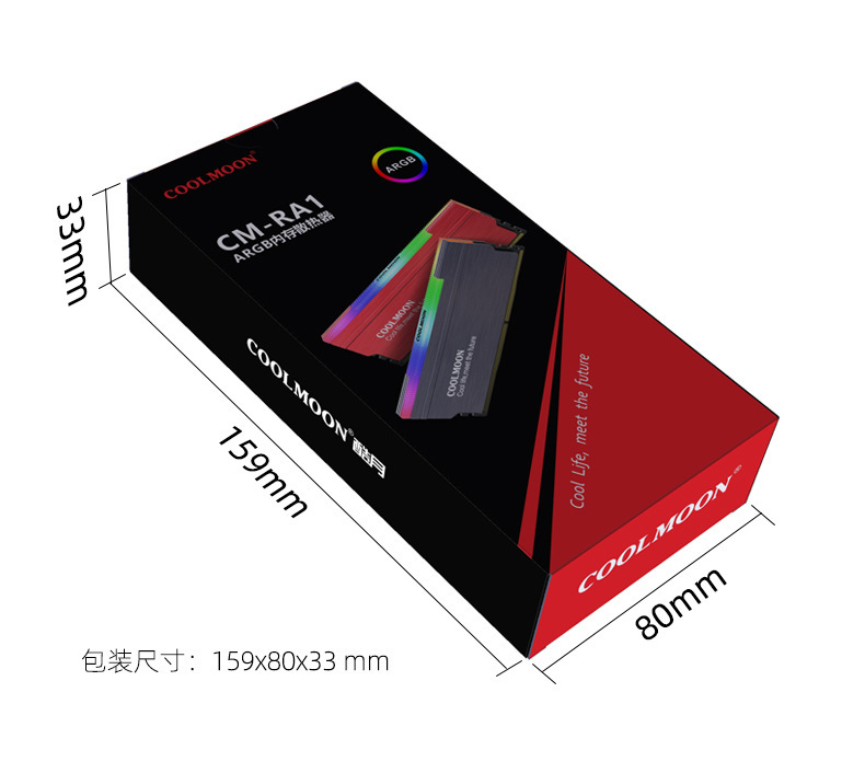 酷月内存马甲,拥有ARGB炫酷灯光,配有导热硅脂片,给内存辅助散热,独立彩盒包装,90pcs/box,单箱尺寸:51*33*26cm,8kg/box,支持跨境销售,大量现货供应!
