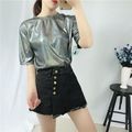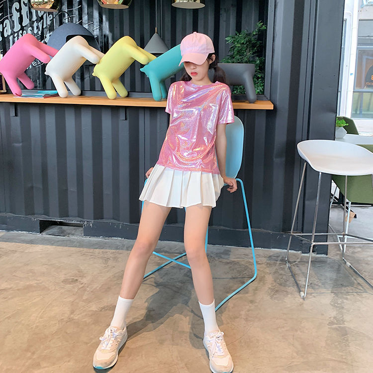 색상 변경 반사 샤이니 여성용 반팔 티셔츠 스퀘어 댄스 티셔츠 루즈한 플러스 사이즈 중간 길이 샤이니 실크 퍼포먼스 세트