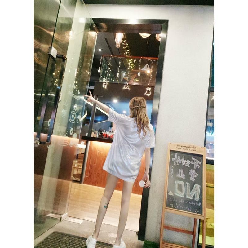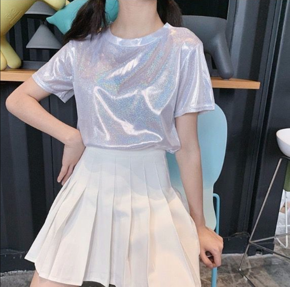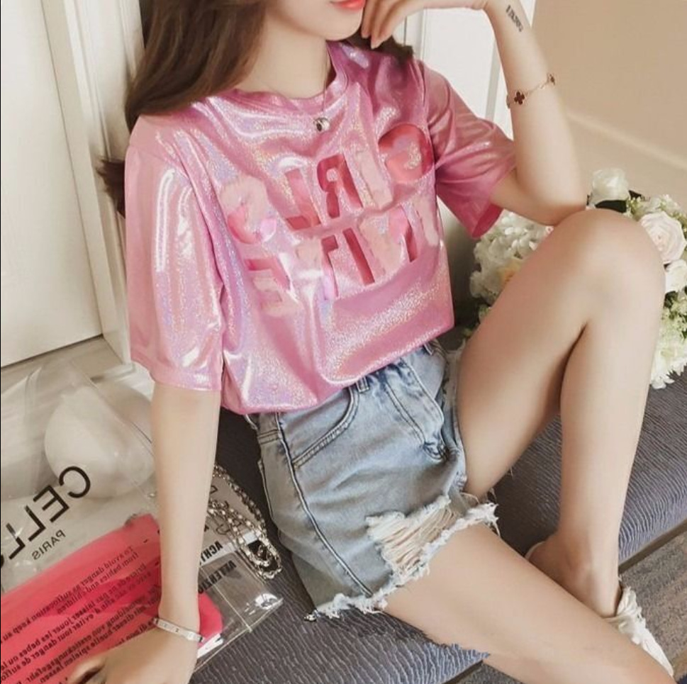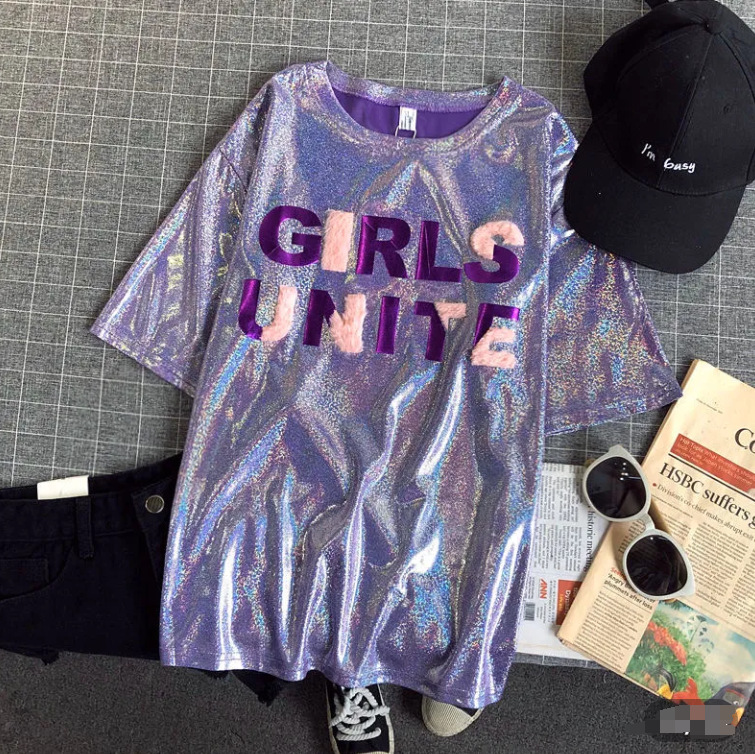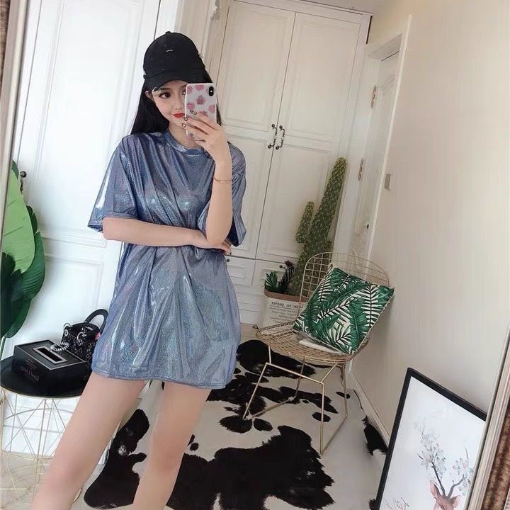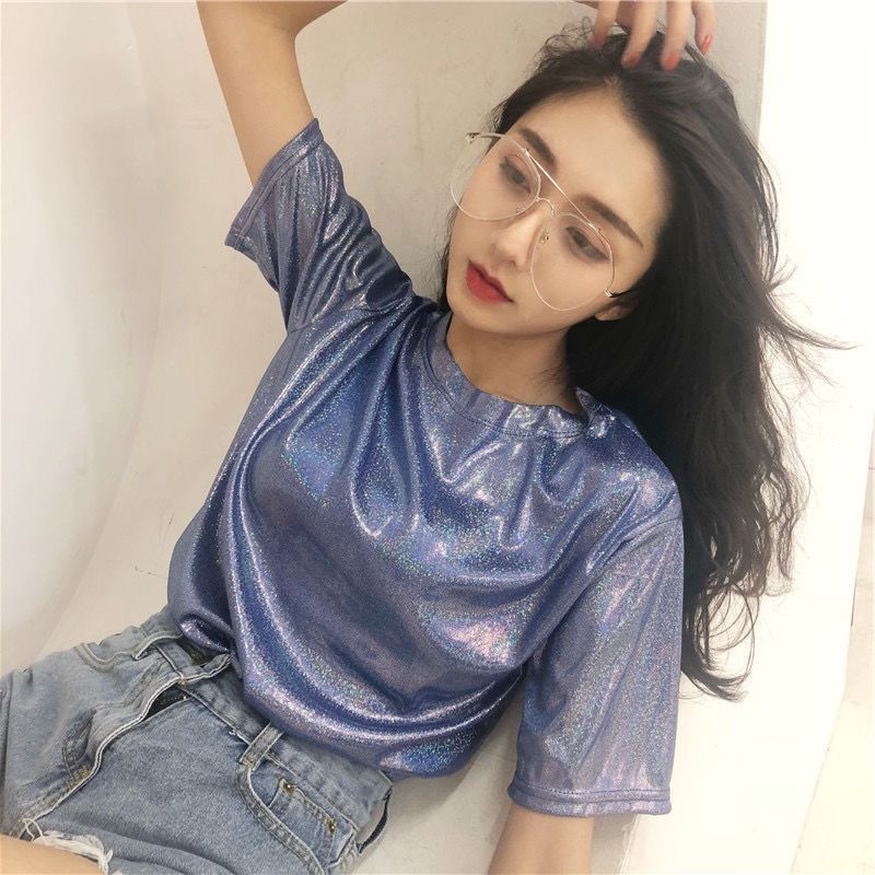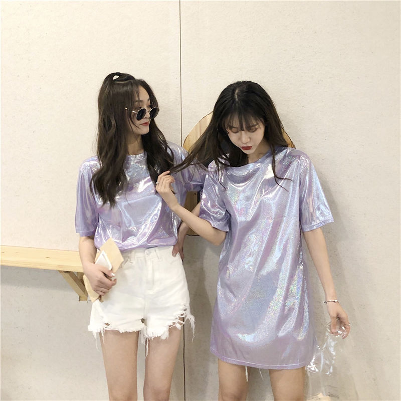 색상 변경 반사 샤이니 여성용 반팔 티셔츠 스퀘어 댄스 티셔츠 루즈한 플러스 사이즈 중간 길이 샤이니 실크 퍼포먼스 세트스토어 가기