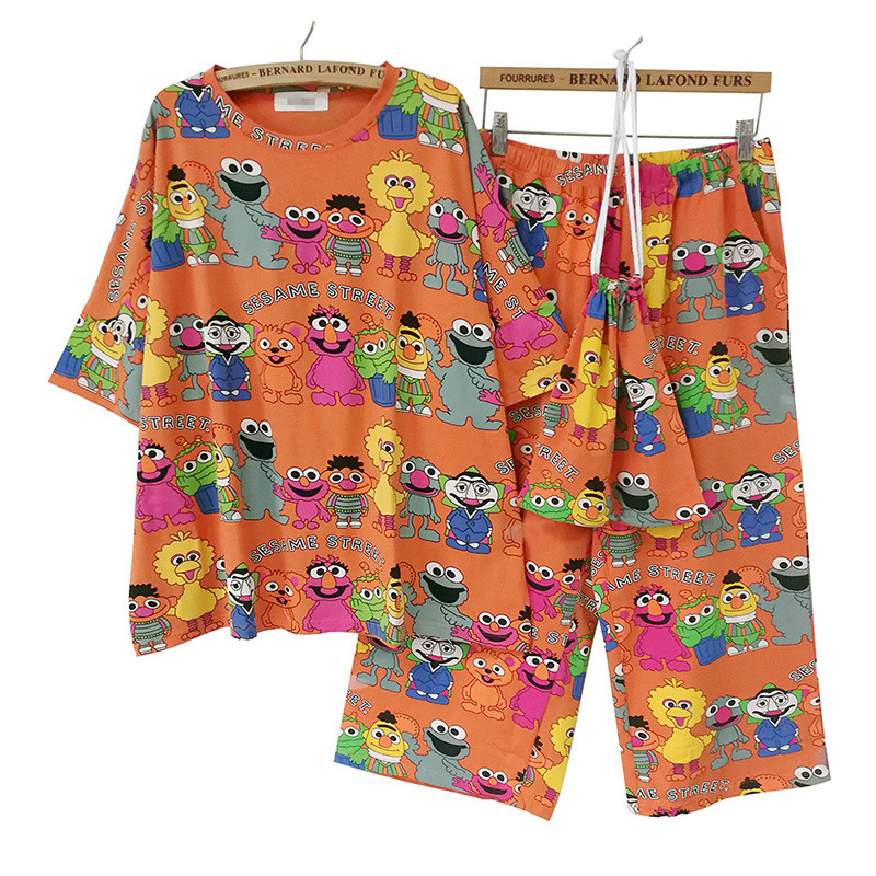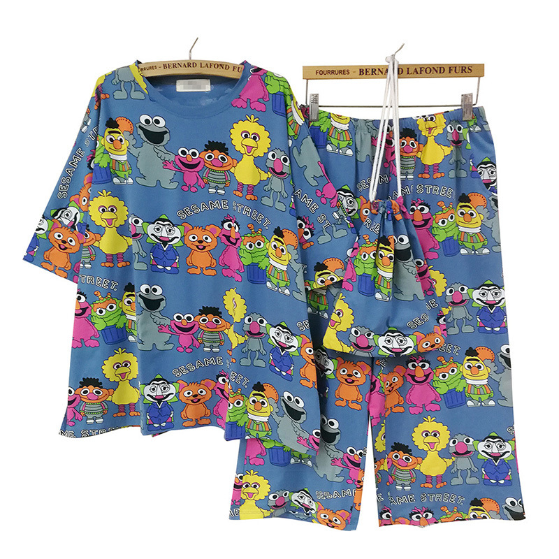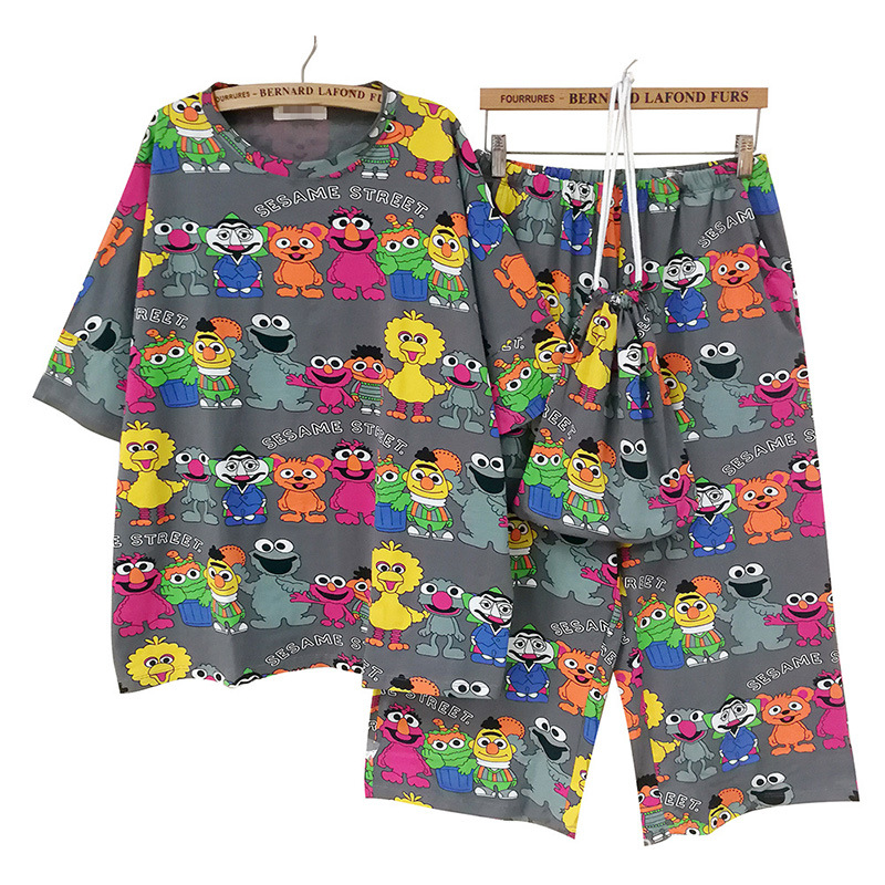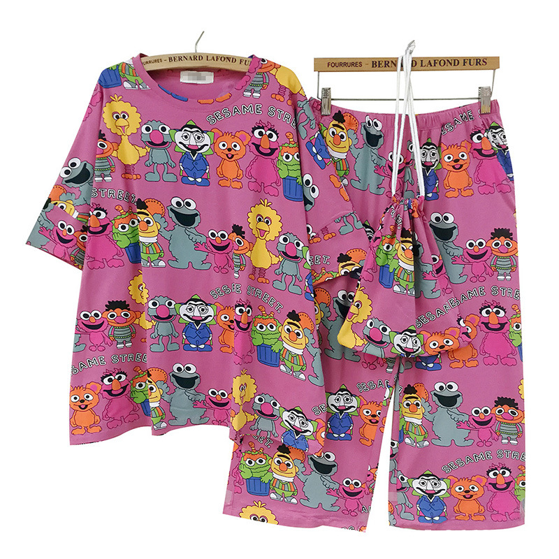 웃는 사랑 면 잠옷 여성용 여름 만화 가방 잠옷 반소매 자른 바지 가정용 옷은 머리카락 밖에서 입을 수 있습니다스토어 가기