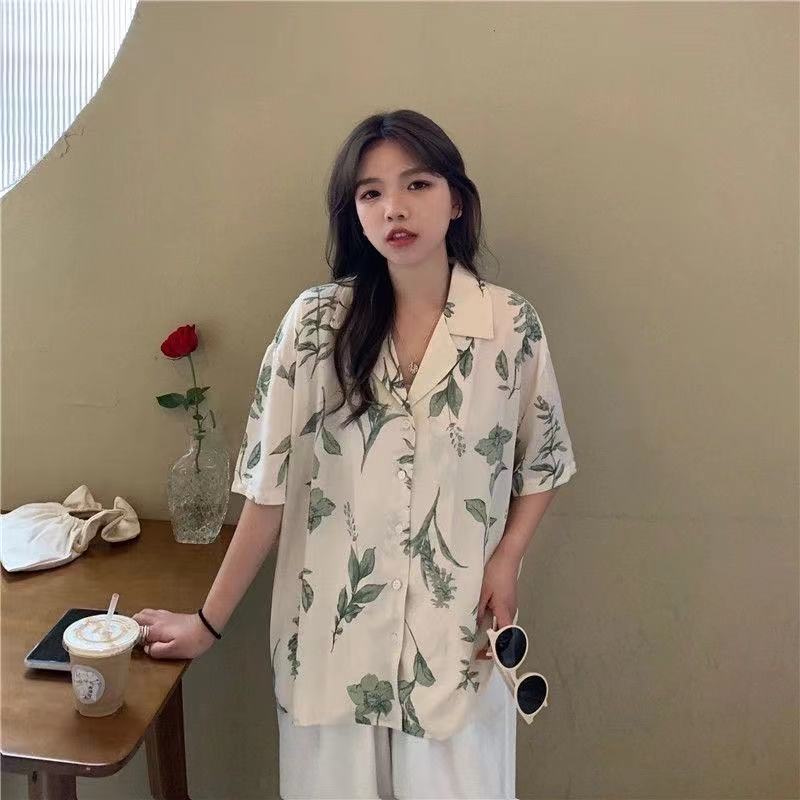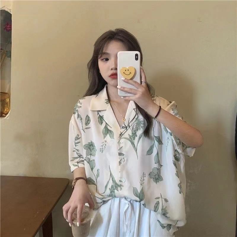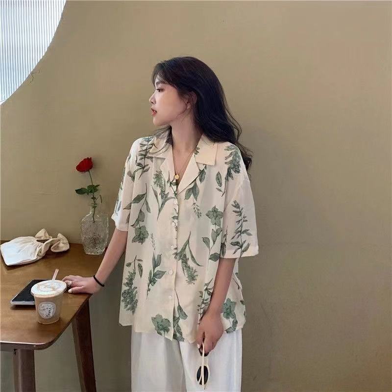 홍콩 스타일 세련된 느슨한 원피스 칼라 인쇄 반팔 셔츠 탑 여자의 여름 우아한 플러스 사이즈 드레이핑 겉옷을 입고 셔츠