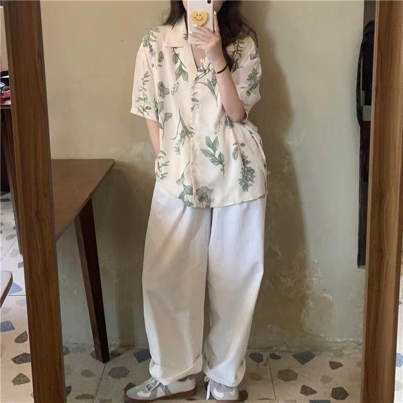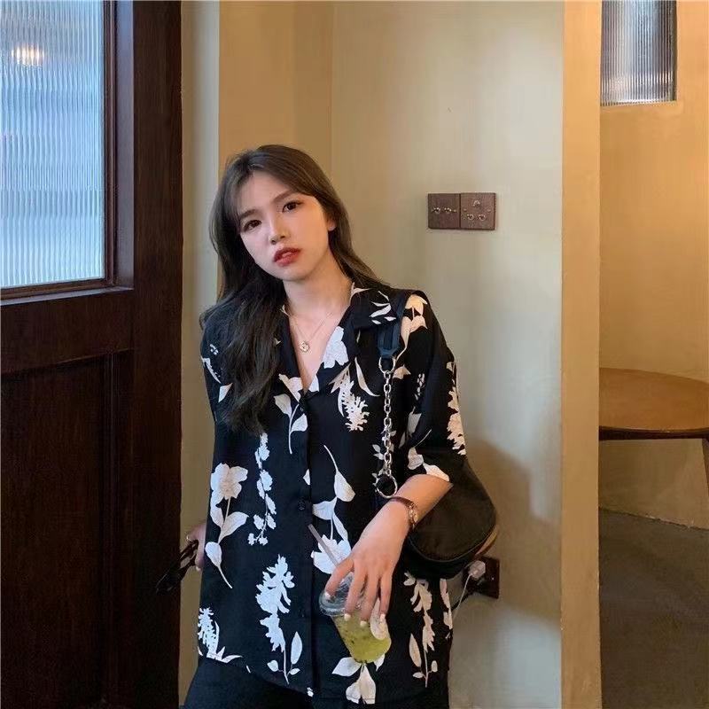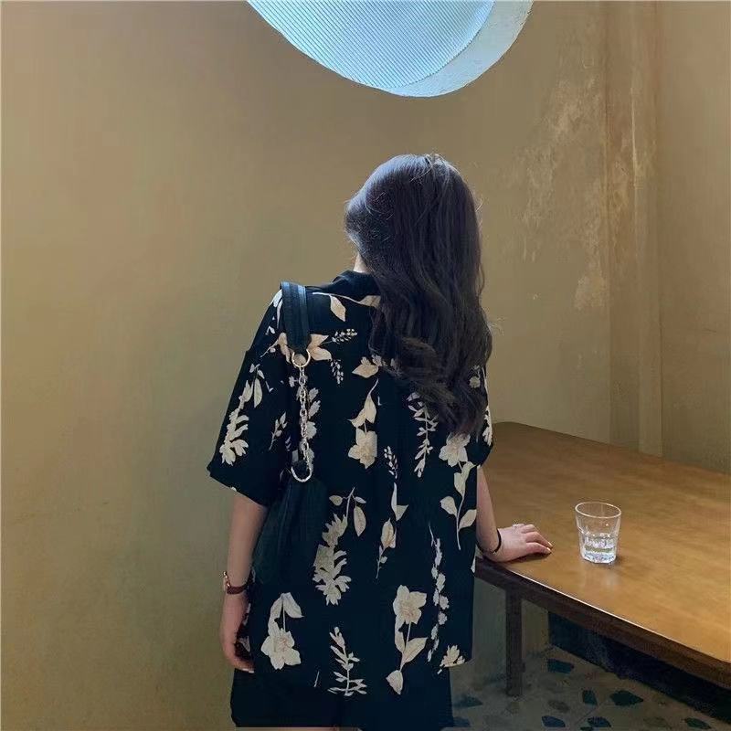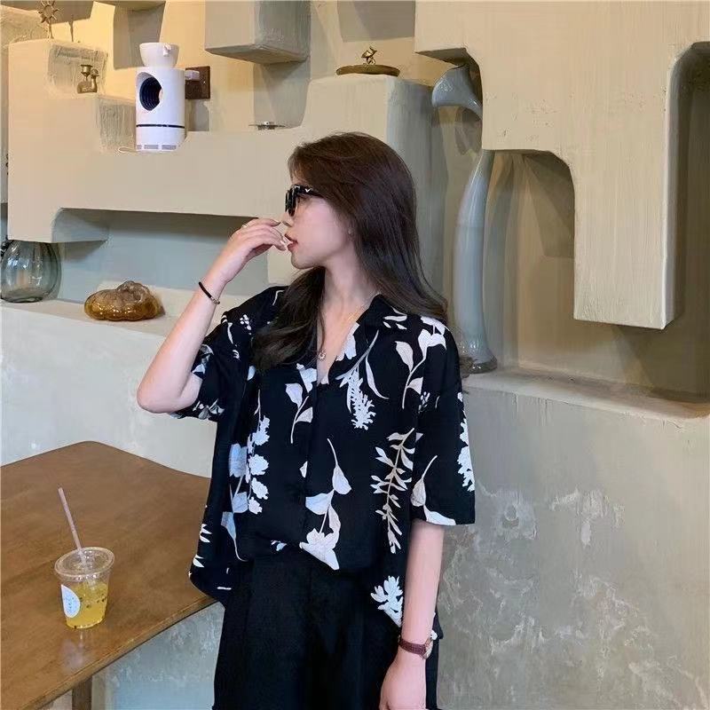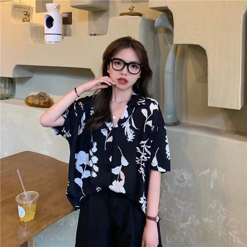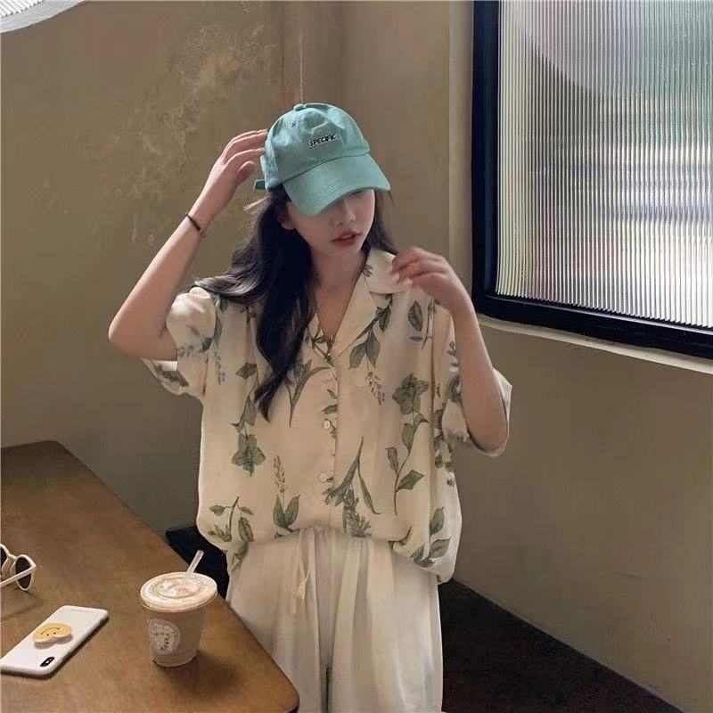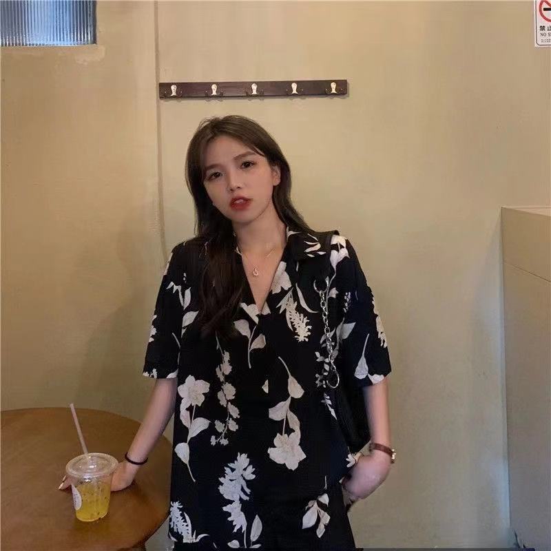 홍콩 스타일 세련된 느슨한 원피스 칼라 인쇄 반팔 셔츠 탑 여자의 여름 우아한 플러스 사이즈 드레이핑 겉옷을 입고 셔츠스토어 가기