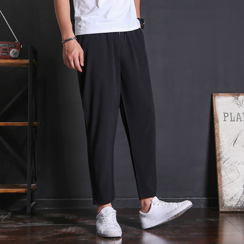 아이스 실크 스트레치 얇은 발목 길이 바지 남자의 여름 한국식 느슨한 캐주얼 바지 블랙 플러스 사이즈 할란 바지 남자의 발 없는 바지스토어 가기