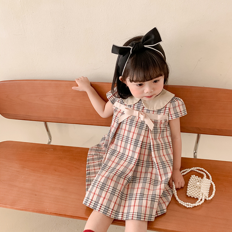 2025 여름 대학 스타일 소녀 드레스 인형 옷깃 반팔 격자 무늬 스커트 1-6 세 활 소녀 스커트스토어 가기