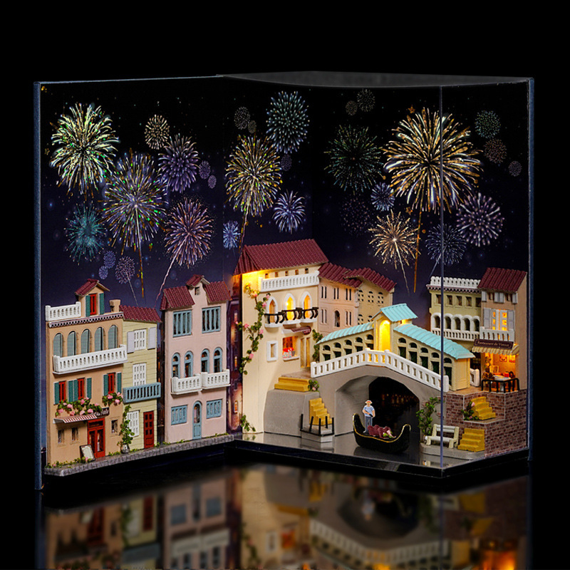 Zhiquwu diy 캐빈 워터 시티 로그 열기구 책 스탠드 시리즈 미니 북 하우스 월드 캐빈 장식품