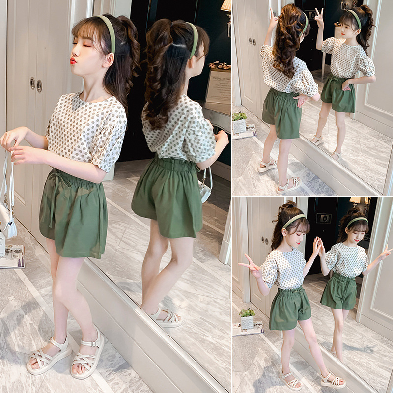 인터넷 축하 소녀의 여름 세트 2024 새로운 서양식 어린이 여름 어린 소녀 한국 스타일 웨이브 도트 한국 스타일 반바지 유행