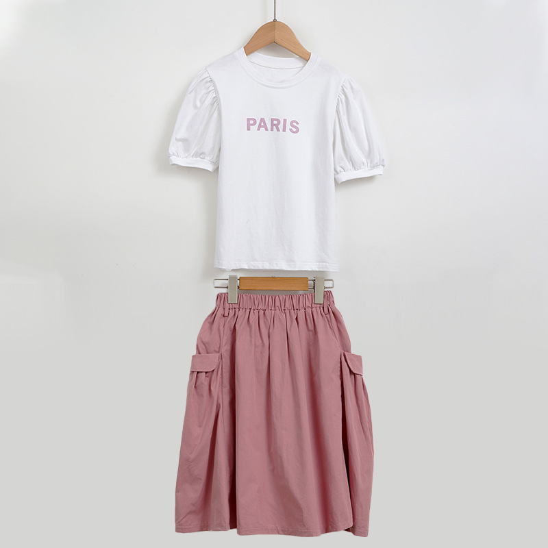 여아 정장 2024 여름 한국 스타일 아동복 캐주얼 학생 스타일 반팔 상의 티셔츠 스커트 투피스 세트
