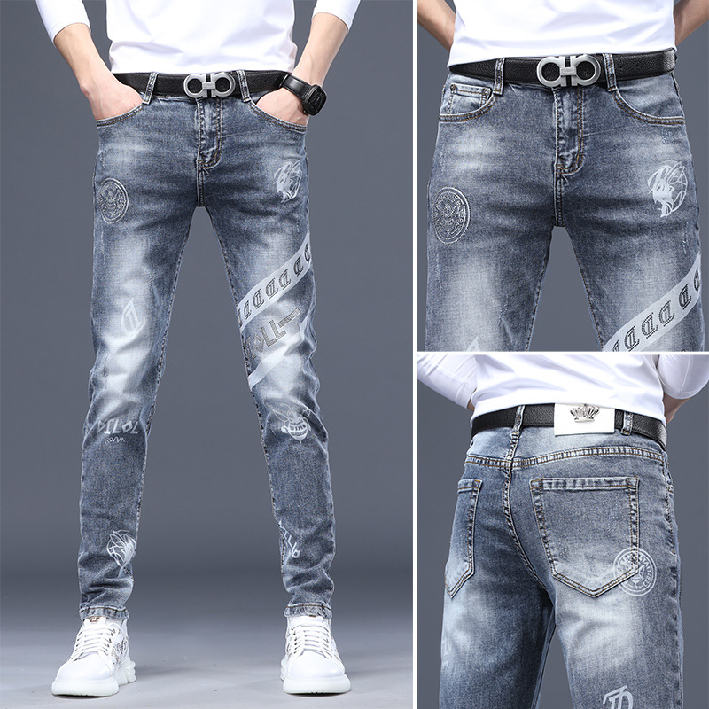 유럽 남성 청바지 청소년 프린트 핫 다이아몬드 반사 스트레치 슬림 스몰 스트레이트 남성 데님 롱 팬츠스토어 가기