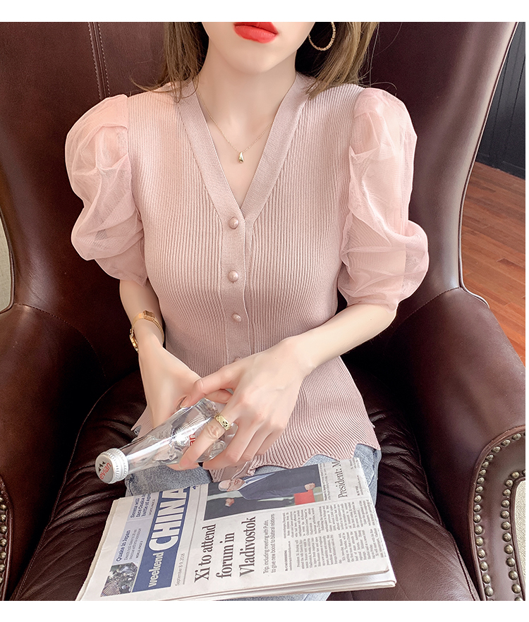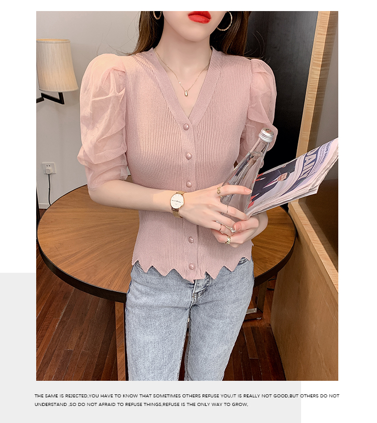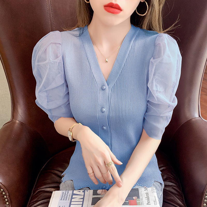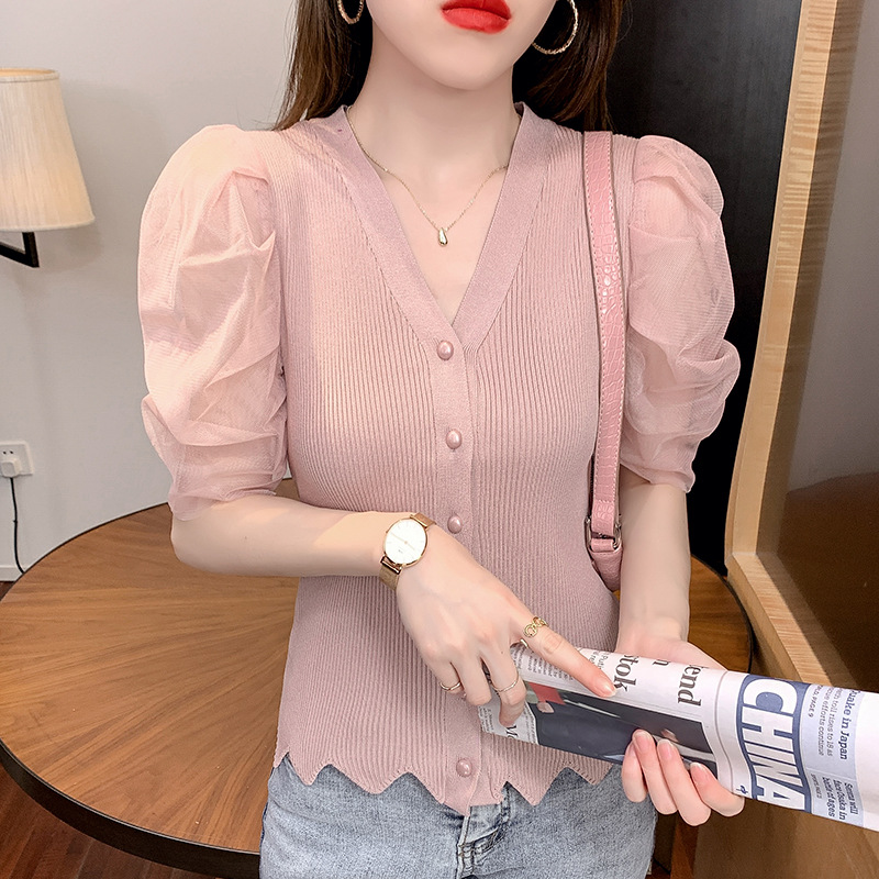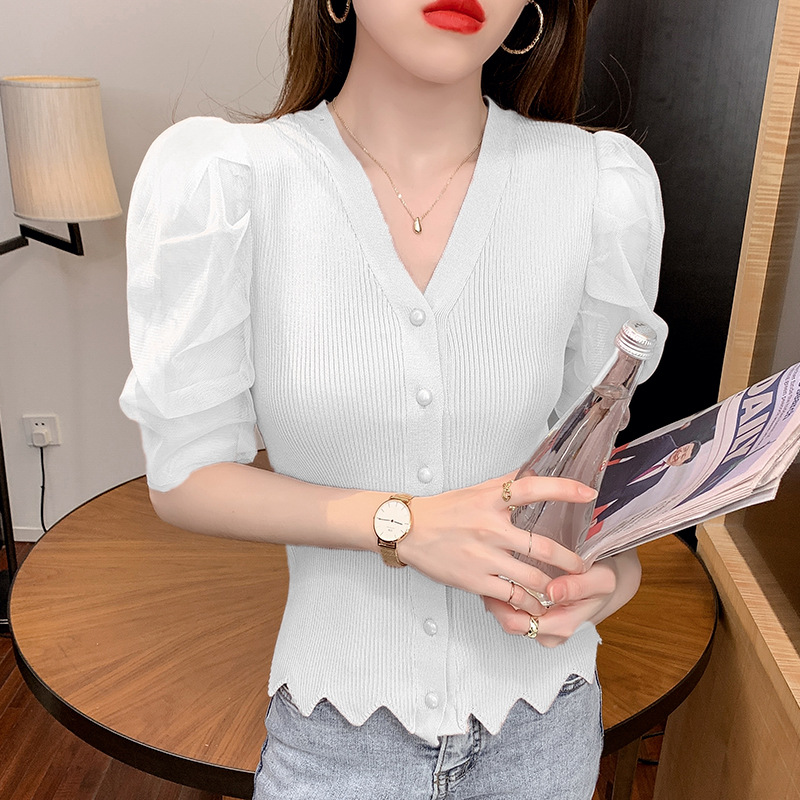신상품 2025 여름 스타일 브이넥 레이스 트리밍 퍼프 소매 슬림핏 숏 니트 단추 카디건