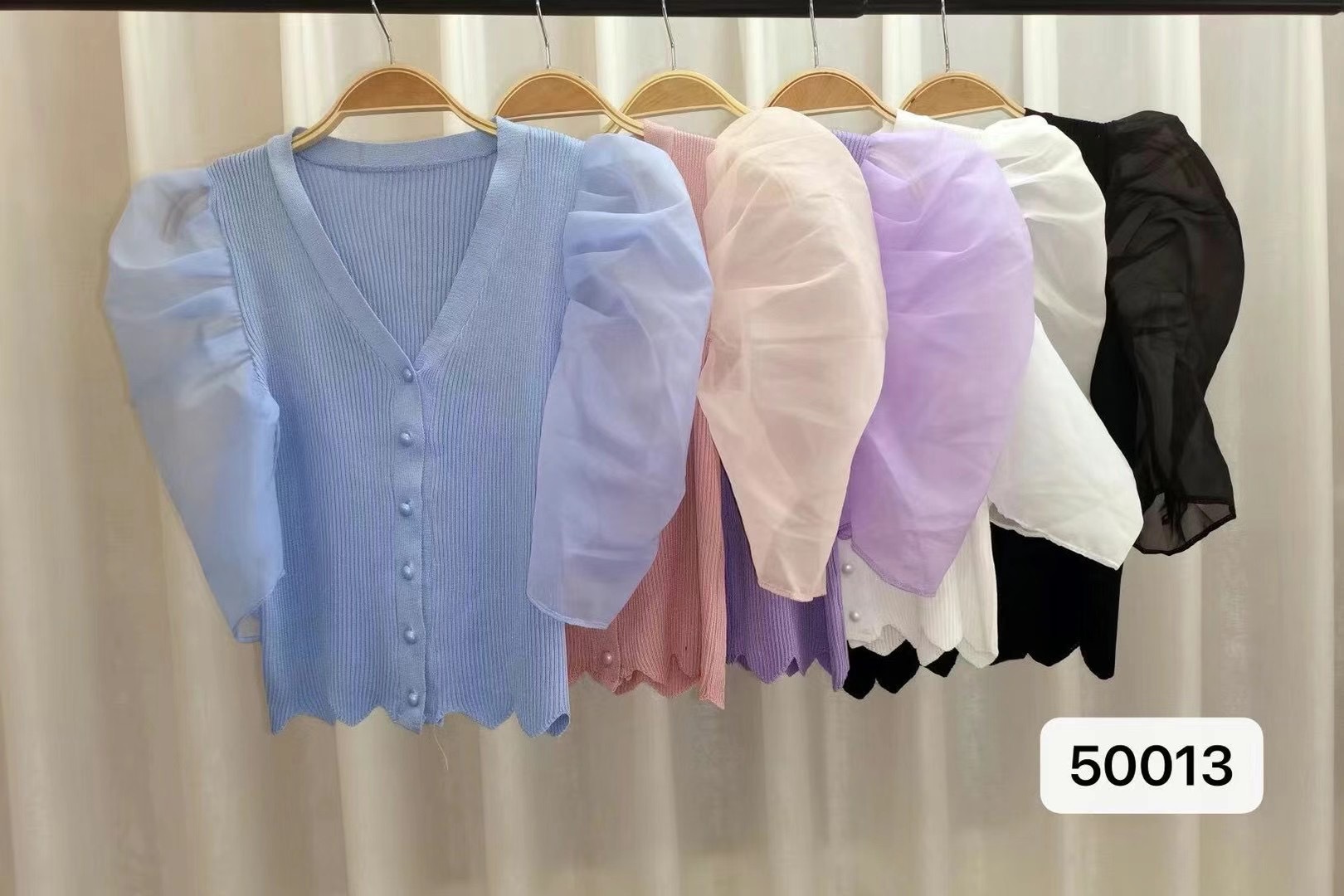 신상품 2025 여름 스타일 브이넥 레이스 트리밍 퍼프 소매 슬림핏 숏 니트 단추 카디건스토어 가기