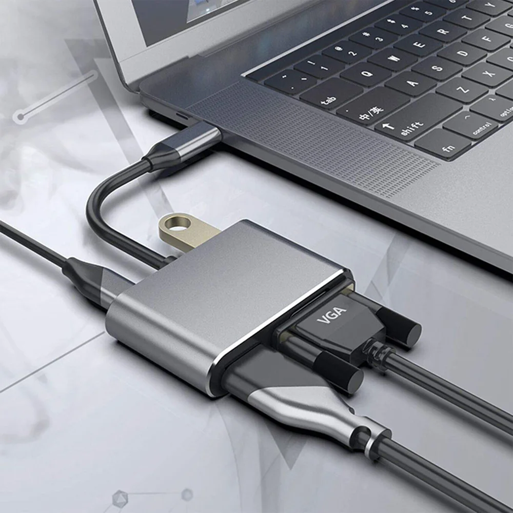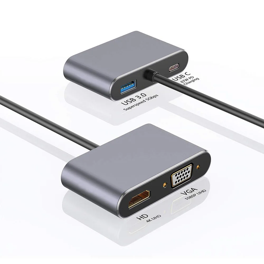 产品功能: USB 3.1 Type-C To USB3.0HUB + USB-C PD充电+HDMI 4K+VGA,数据传输和电脑和手机设备充电,USB3.0接口 可连接优盘、鼠标、键盘、移动硬盘,游戏手柄 等外接设备,HDMI VGA接口可连接4K高清电视或投影仪等。