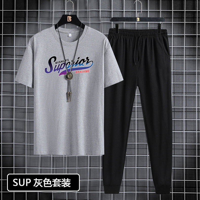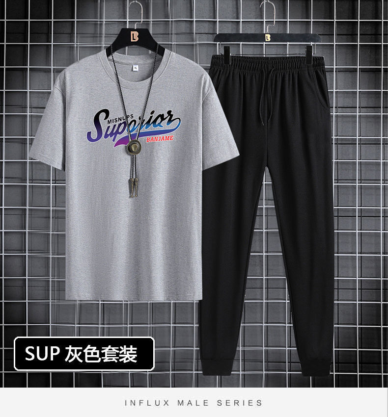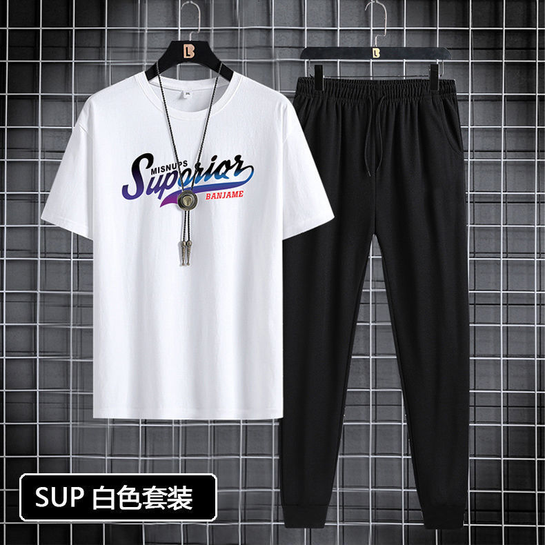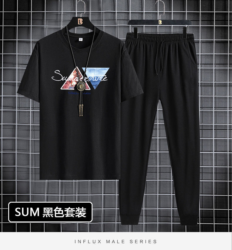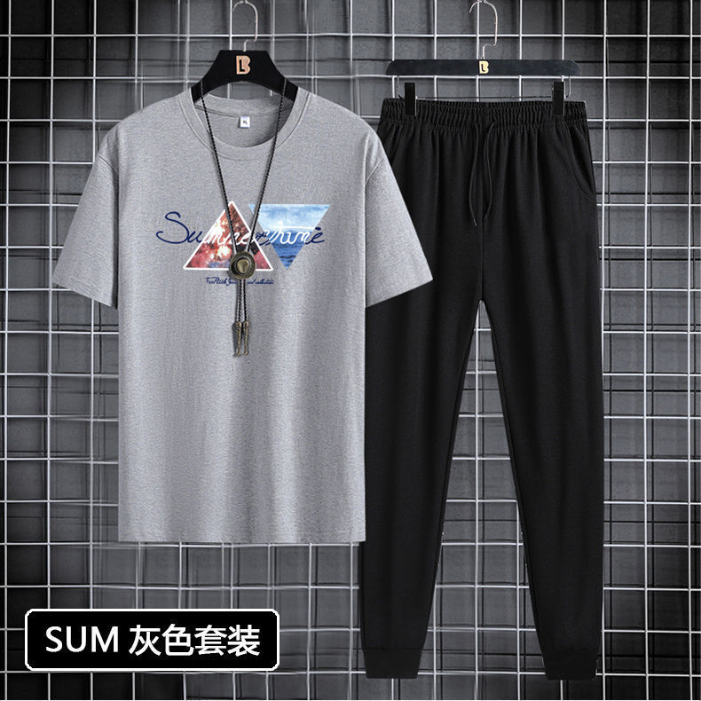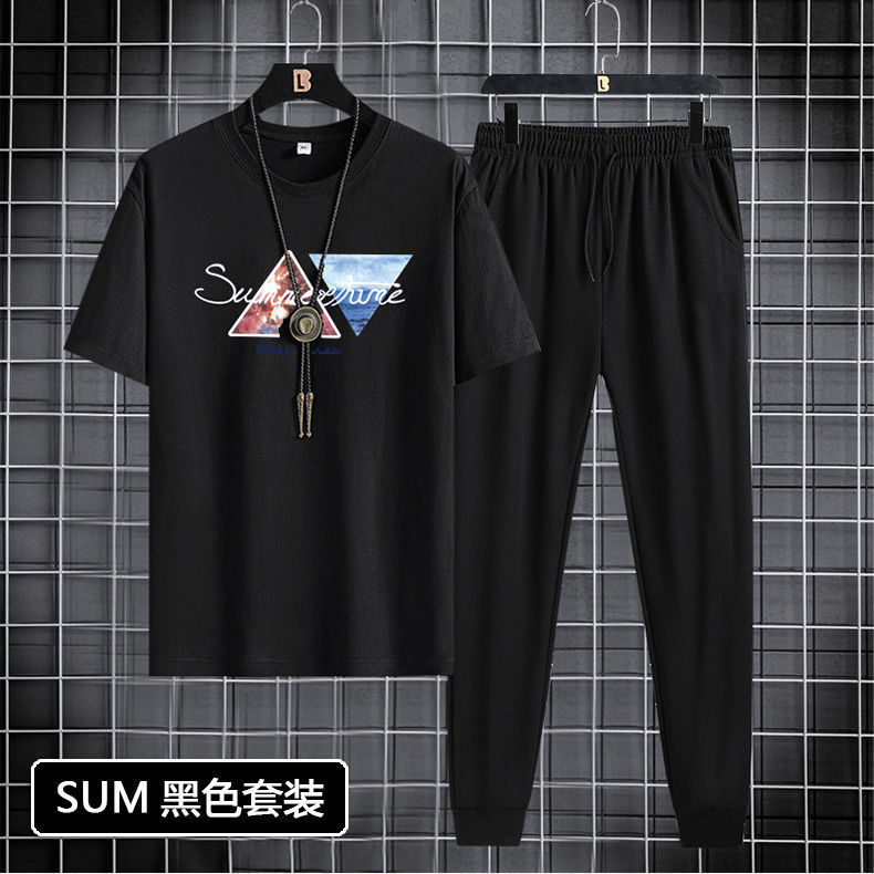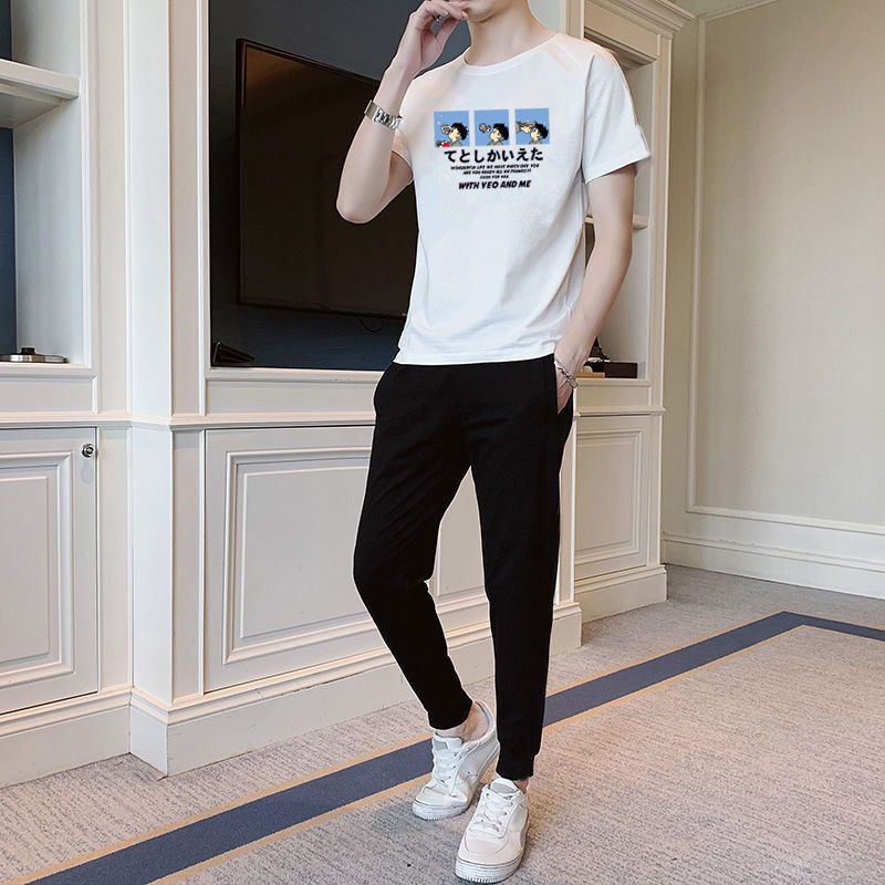 반팔 긴바지 세트 남성용 2024 청소년 남성 스포츠 캐주얼 라운드넥 프린트 투피스 세트 한국 스타일 캐주얼스토어 가기