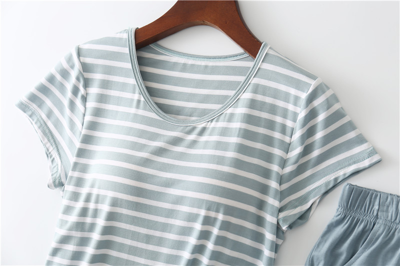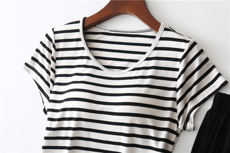 가슴 패드 포함 스트라이프 반팔 모달 프리 브래지어 잠옷 여성용 컵 원피스 반팔 티셔츠 여성용 하의 가정복